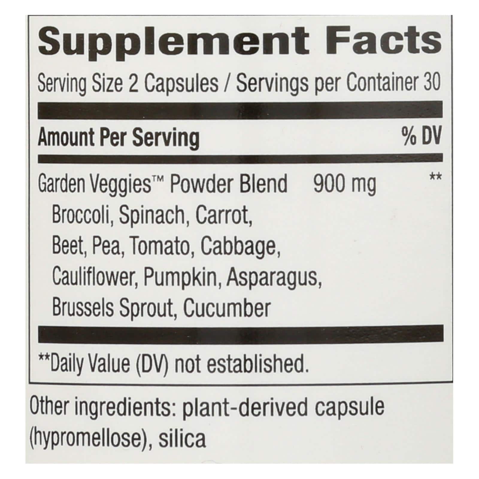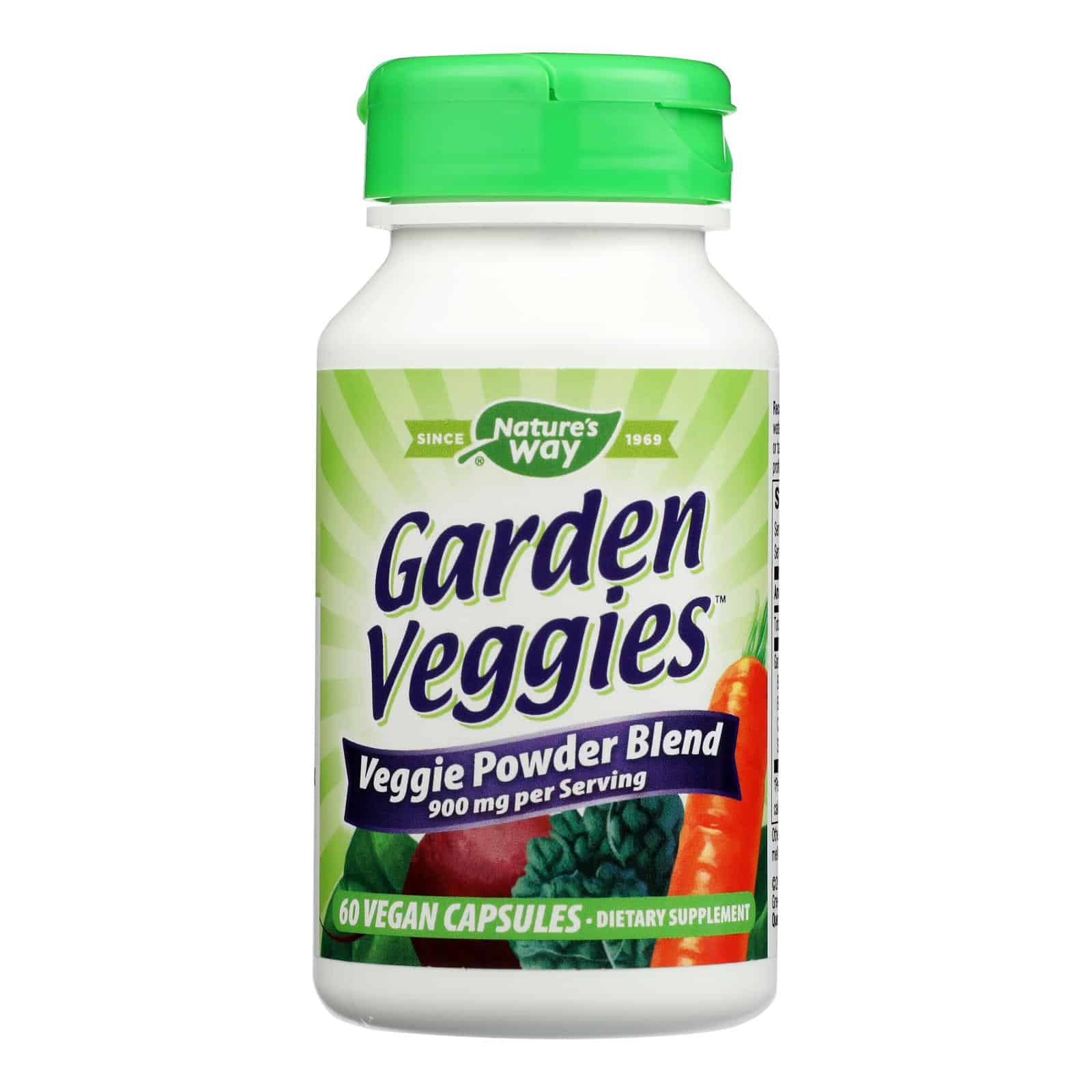 NATURE’S WAY DIETARY SUPPLEMENT GARDEN VEGGIES CAN HELP YOU ENSURE THAT YOU ARE GETTING ALL THE NUTRIENTS YOU NEED. OUR 12-VEGETABLE BLEND CONTAINS KALE, BRUSSEL SPROUTS, WHEAT GRASS, SPINACH, ASPARAGUS, BROCCOLI, CAULIFLOWER, PARSELY, BEETS, CABBAGE AND GARLIC. OUR CAPSULES ARE SUITABLE FOR VEGETARIAN DIETS. THIS PACKAGE CONTAINS 60 GARDEN VEGGIE CAPSULES.