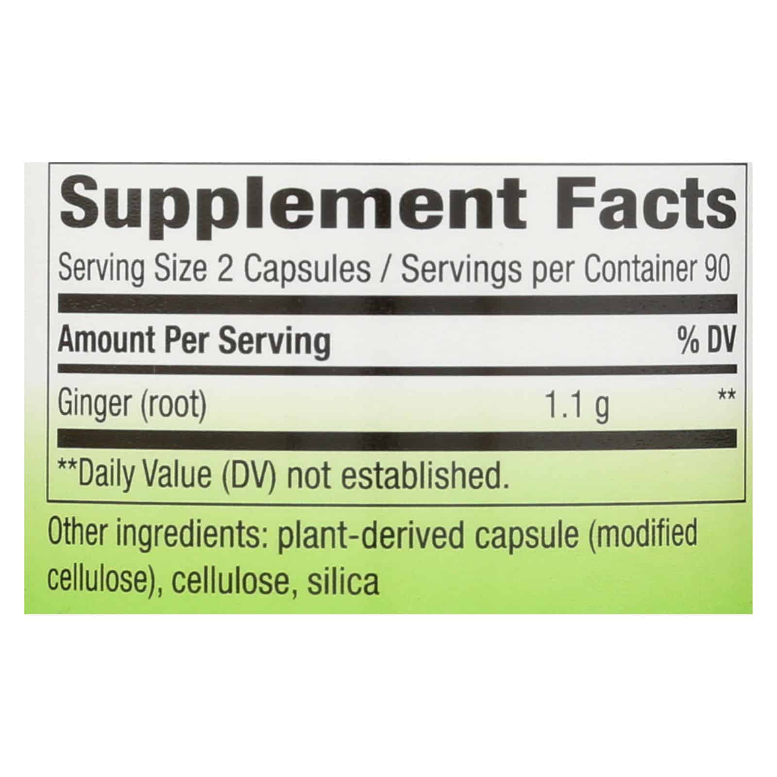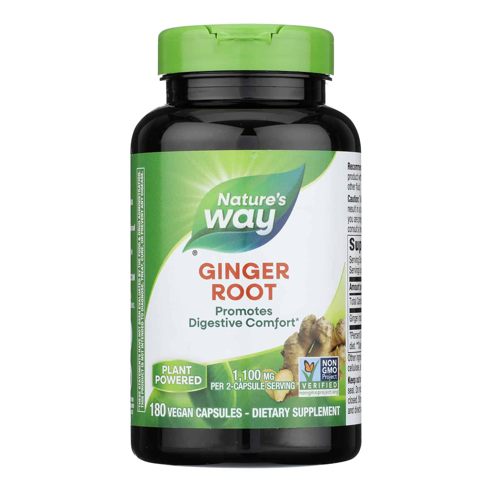 NATURE’S WAY GINGER ROOT CAPSULES CONTAIN 550 MG OF GROUND GINGER. WE MANUFACTURE OUR GINGER ROOT CAPSULES USING MATERIALS THAT ARE NOT GENETICALLY MODIFIED. THESE CAPSULES ARE MADE FROM PLANT-BASED MATERIALS AND ARE SUITABLE FOR VEGETARIAN DIETS. THIS PACKAGE CONTAINS 180 GINGER ROOT CAPSULES, WHICH EQUATES TO 90 TWO-CAPSULE SERVINGS.