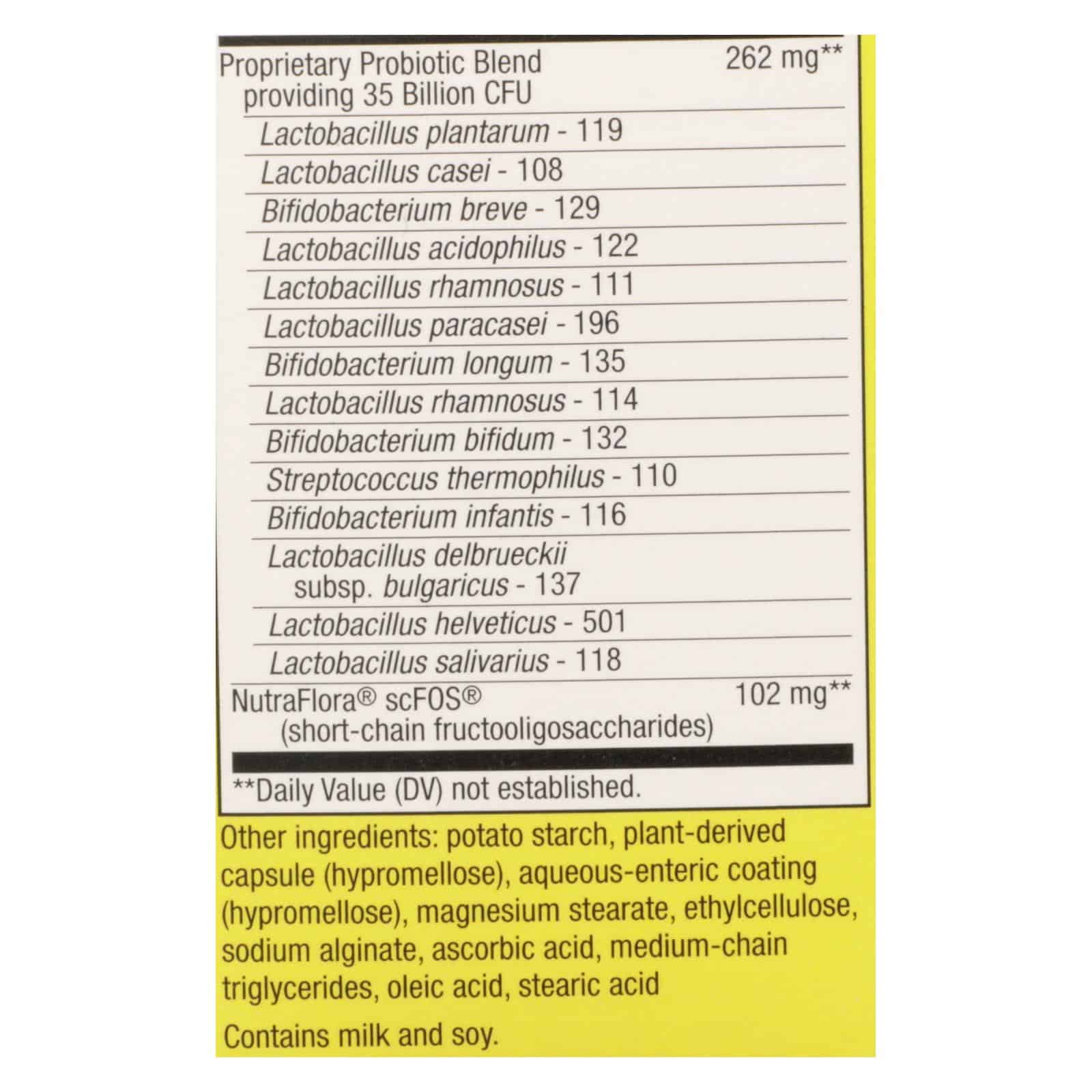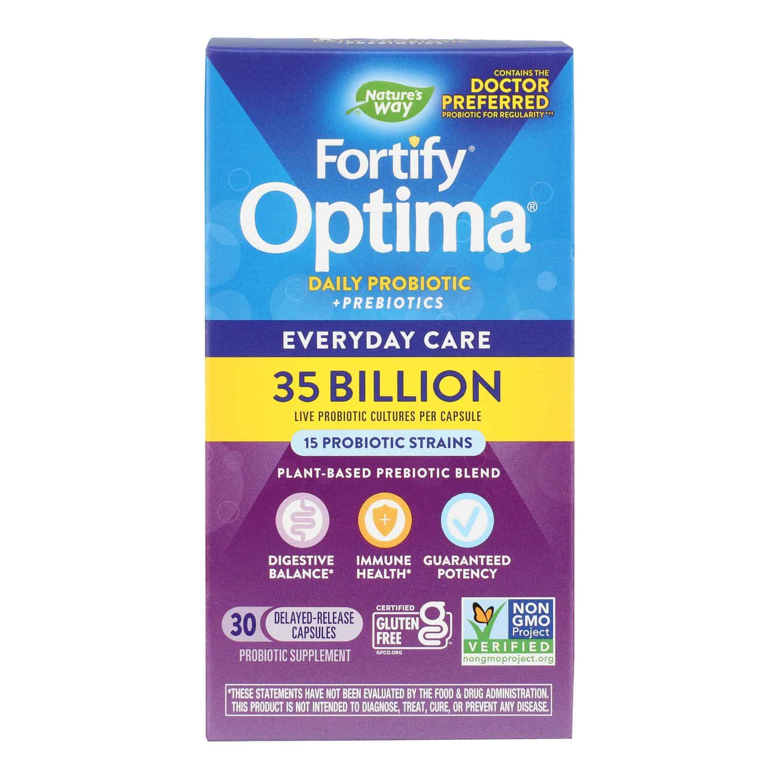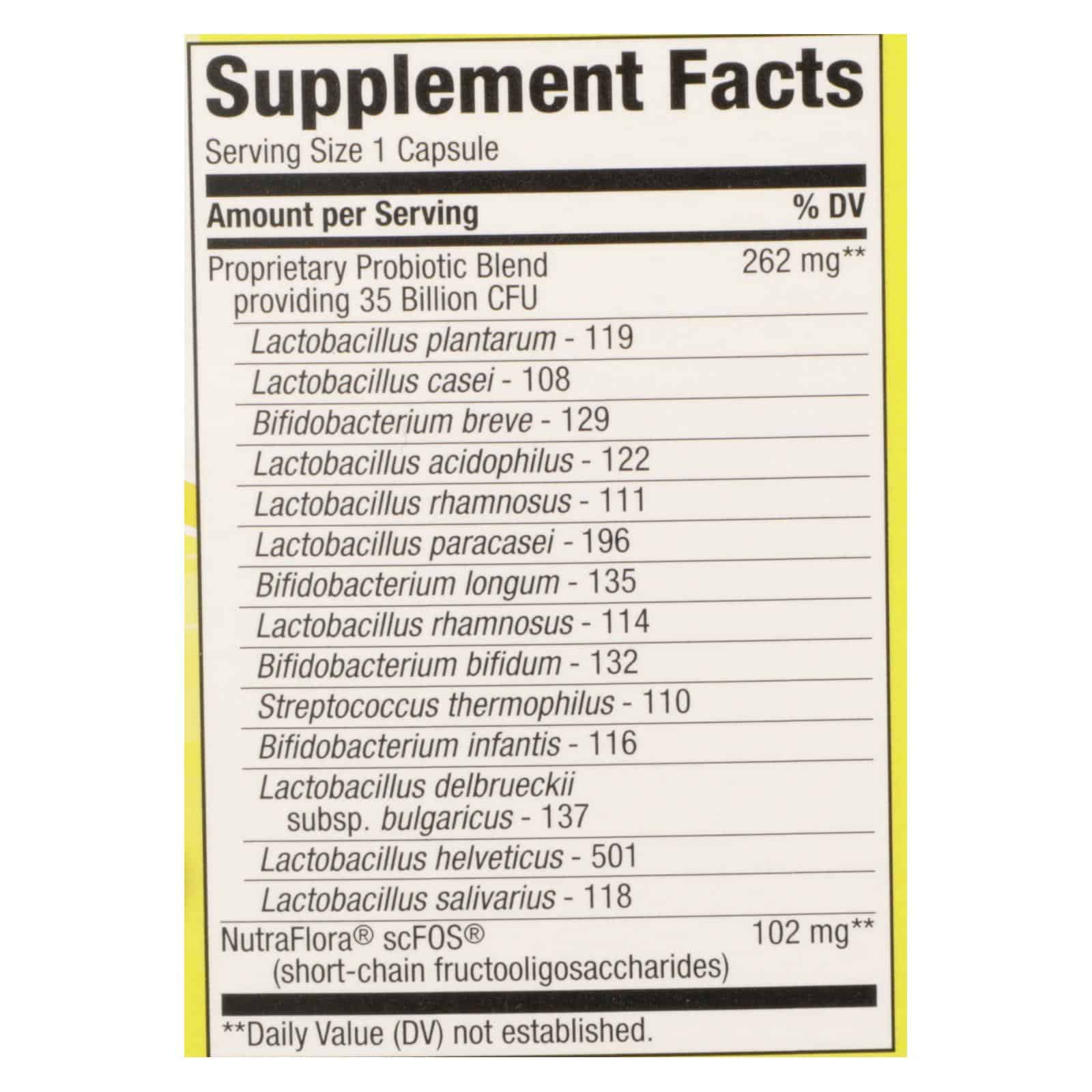 Dietary Supplement. Once daily. For healthy digestive flora. 14 probiotic strains. With NutraFlora scFOS synergistic action. True Identity Lactobacillus & Bifidobacterium super blend. True Potency 35 billion CFU. True Release targeted delivery enteric-coated. Vegetarian capsules. For all ages. Synergistic Probiotic: More stains than other brands. Replenish microflora with Primadophilus Optima. Primadophilus Optima is a potent (35 billion CFUs) and diverse (14 strains) formula of probiotics for intestinal microflora. Why 14 probiotic strains? Like a fingerprint, each individual has a unique balance of stains in their microflora. Primadophilus Optima provides a broad diversity of strains commonly found in the human digestive tract. Each strain provides its own unique benefits. With NutraFlora scFOS: Unique short-chain form of FOS. Preferred food source for microflora. Promotes microflora growth & colonization. More effective than other FOS forms. Importance of Microflora: The friendly bacteria of the intestinal tract are essential to good health because they: Secrete enzymes to aid proper digestion; Produce organic compounds that inhibit the reproduction of harmful bacteria; Boost immune function. Stress, poor diet, age and changes in lifestyle can adversely affect microflora. Exclusively backed by the True Guarantee: True Potency ensured 35 billion CFUs per capsule for the entire shelf life. True Identity ensures only the strains listed on the label are found in the product. True Release enteric-coating ensures stomach acid survival and intestinal delivery. Unique Advantages of Primadophilus Optima: Offers a diverse and unique probiotic and prebiotic combination; 35 billion CFUs (colony forming units) per capsule of 14 synergistic strains; Designed to meet the needs of all ages; With NutraFlora scFOS; Suitable for vegetarians. Enhanced with NutraFlora. Questions? 1-800-9Nature. naturesway.com. (This statement has not been evaluated by the Food & Drug Administration. This product is not intended to diagnose, treat, cure or prevent any disease.) Product of Canada.