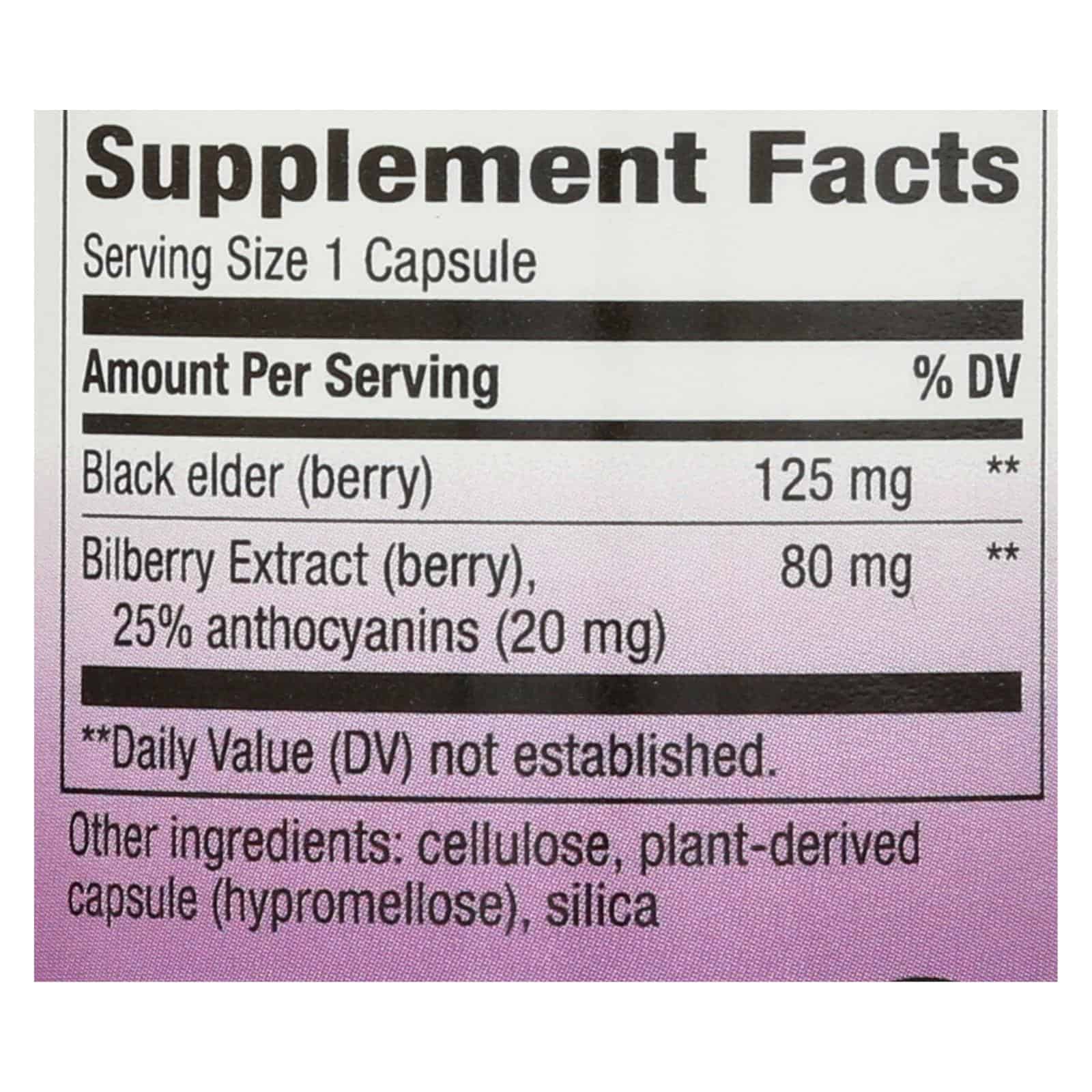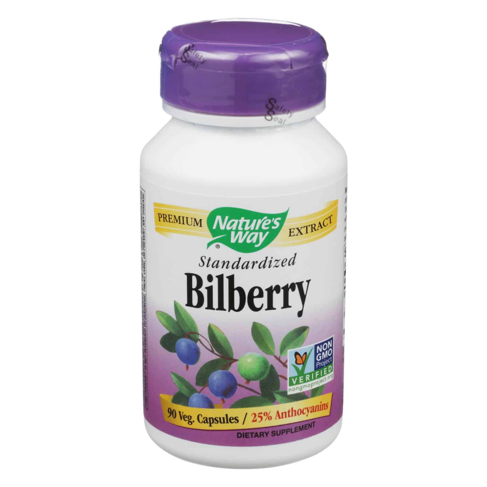NATURE’S WAY STANDARDIZED BILBERRY EXTRACT DIETARY SUPPLEMENT SUPPORTS EYE FUNCTION THANKS TO A BLEND OF BLACK ELDERBERRY AND BILBERRY EXTRACT. EACH VEGETARIAN CAPSULE IN THIS 90 COUNT BOTTLE PROVIDES 20 MG. OF ANTHOCYANINS. CONSUME ONE CAPSULE THREE TIMES DAILY, PREFERABLY WITH FOOD, OR YOU CAN DOUBLE THE DOSAGE FOR INTENSIVE USE.