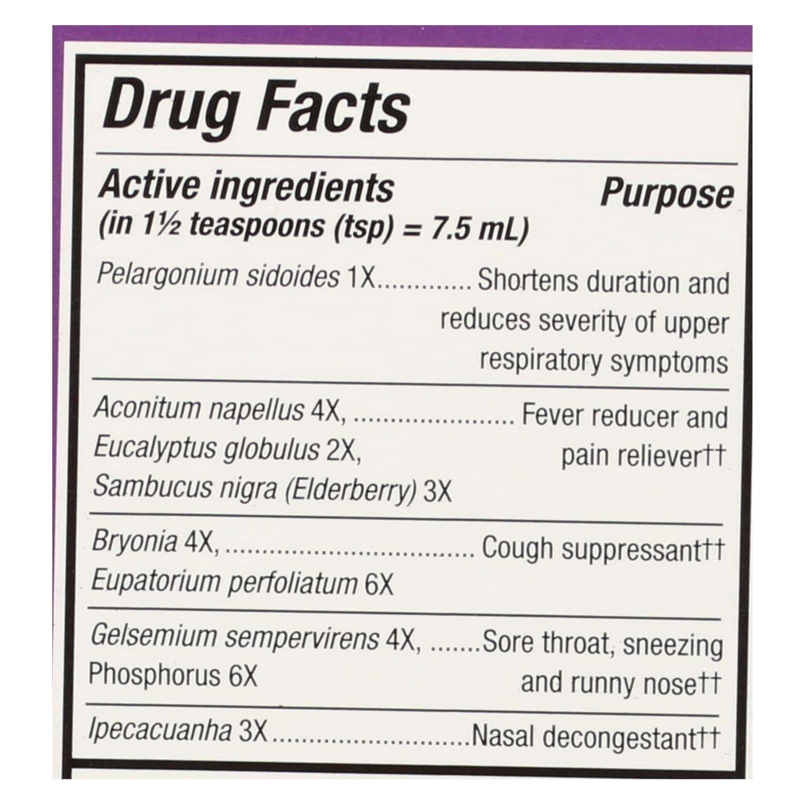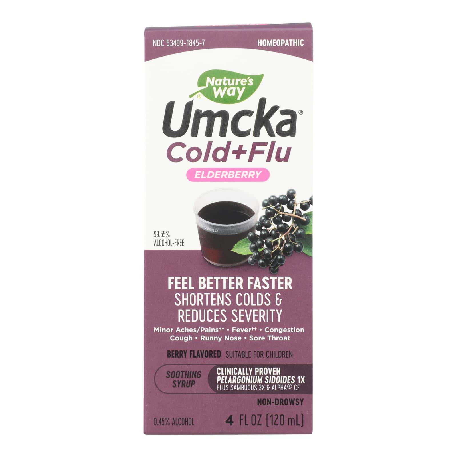 NATURE’S WAY UMCKA ELDERBERRY INTENSIVE COLD+FLU SYRUP IS A HOMEOPATHIC COMBINATION OF PELARGONIUM SIDOIDES 1X AND ALPHA CF IN A BASE OF BLACK ELDERBERRY EXTRACT. COLD AND FLU SYMPTOMS CAN BE SO SIMILAR THAT IT CAN BE DIFFICULT TO DETERMINE THE CAUSE OF YOUR DISCOMFORT. UMCKA ELDERBERRY INTENSIVE COLD+FLU COMBINES UMCKA AND THE ALPHA CF BLEND WITH A BLACK ELDERBERRY EXTRACT TO TACKLE BOTH COLD AND FLU SYMPTOMS. OUR LIQUID FORMULA IS VEGAN FRIENDLY AND A BLEND OF 9 DIFFERENT HOMEOPATHIC MEDICINES. SEE DRUG FACTS PANEL FOR ALLERGENS. INCLUDES ONE 4 OZ. BOTTLE OF UMCKA ELDERBERRY INTENSIVE COLD+FLU SYRUP. AT NATURE?S WAY, WE HAVEN?T FORGOTTEN OUR PAST, NOR HAVE WE LOST TRACK OF WHY TOM STARTED THE COMPANY IN THE FIRST PLACE. A SIMPLE DESIRE TO DO SOMETHING MORE FOR PEOPLE. TO HELP THEM ENHANCE THEIR HEALTH. THIS HAS BECOME THE BASIS OF EVERYTHING WE DO. THE VERY FOUNDATION OF A GROWING LEGACY OF TRUST AND AN OATH TO OUR CUSTOMERS THAT WE TAKE INCREDIBLY SERIOUSLY.