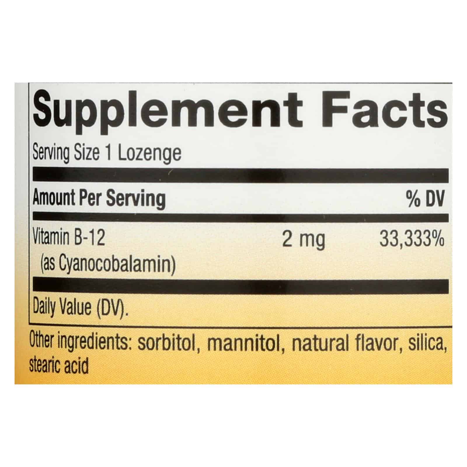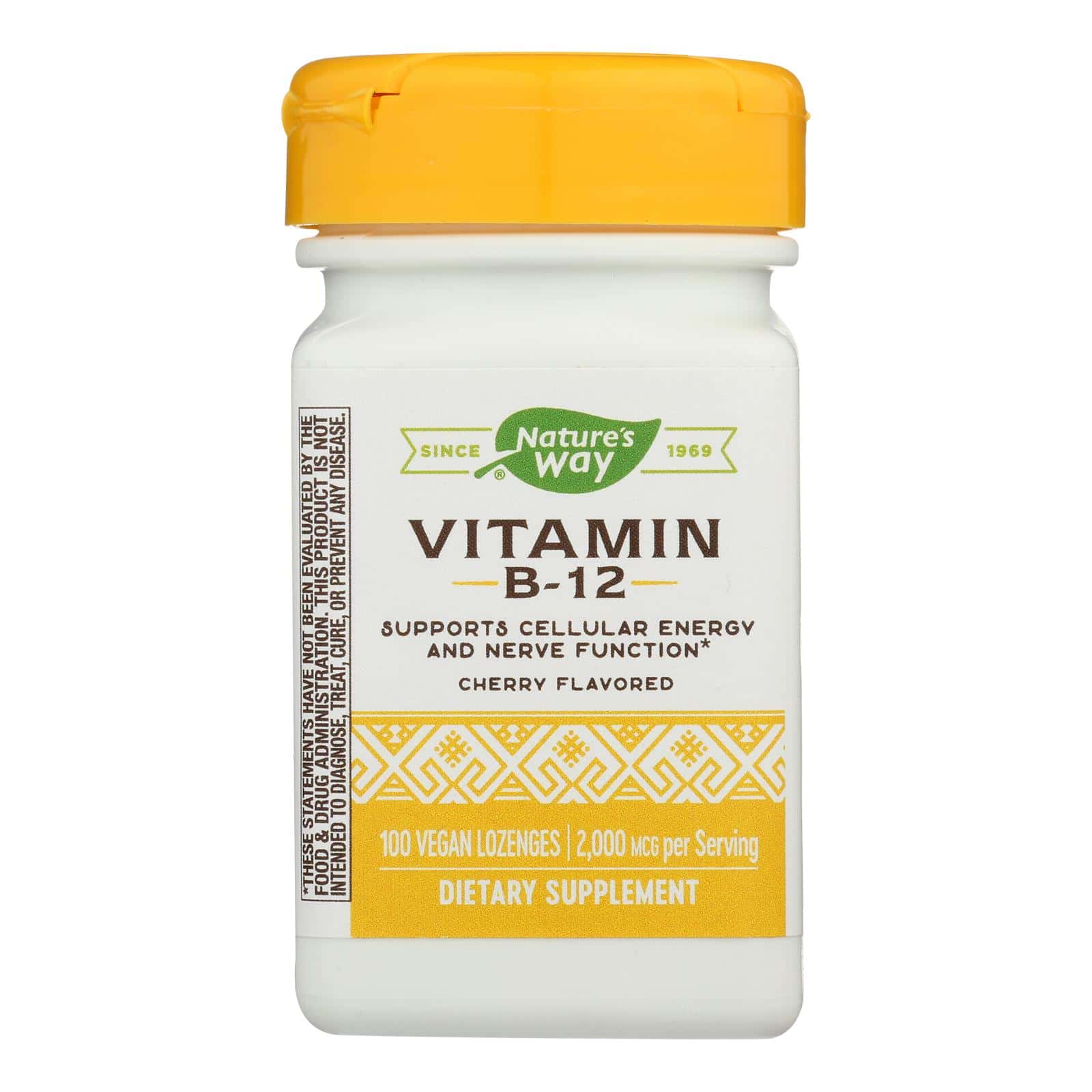 NATURE’S WAY CHERRY FLAVORED VITAMIN B-12 LOZENGES DELIVER THE VITAMINS YOUR BODY NEEDS IN A FRUITY LOZENGE WITH AN EASY-DISSOLVE DESIGN FOR FUSS-FREE CONSUMPTION. WE MAKE OUR 2,000 MCG. LOZENGES WITHOUT ARTIFICIAL COLORS, FLAVORS OR PRESERVATIVES TO KEEP THEM SIMPLE AND NATURAL. TAKE A SINGLE LOZENGE DAILY FROM THIS 100 COUNT PACKAGE TO HELP SUPPORT RED BLOOD CELL AND NERVE SHEATH PRODUCTION.