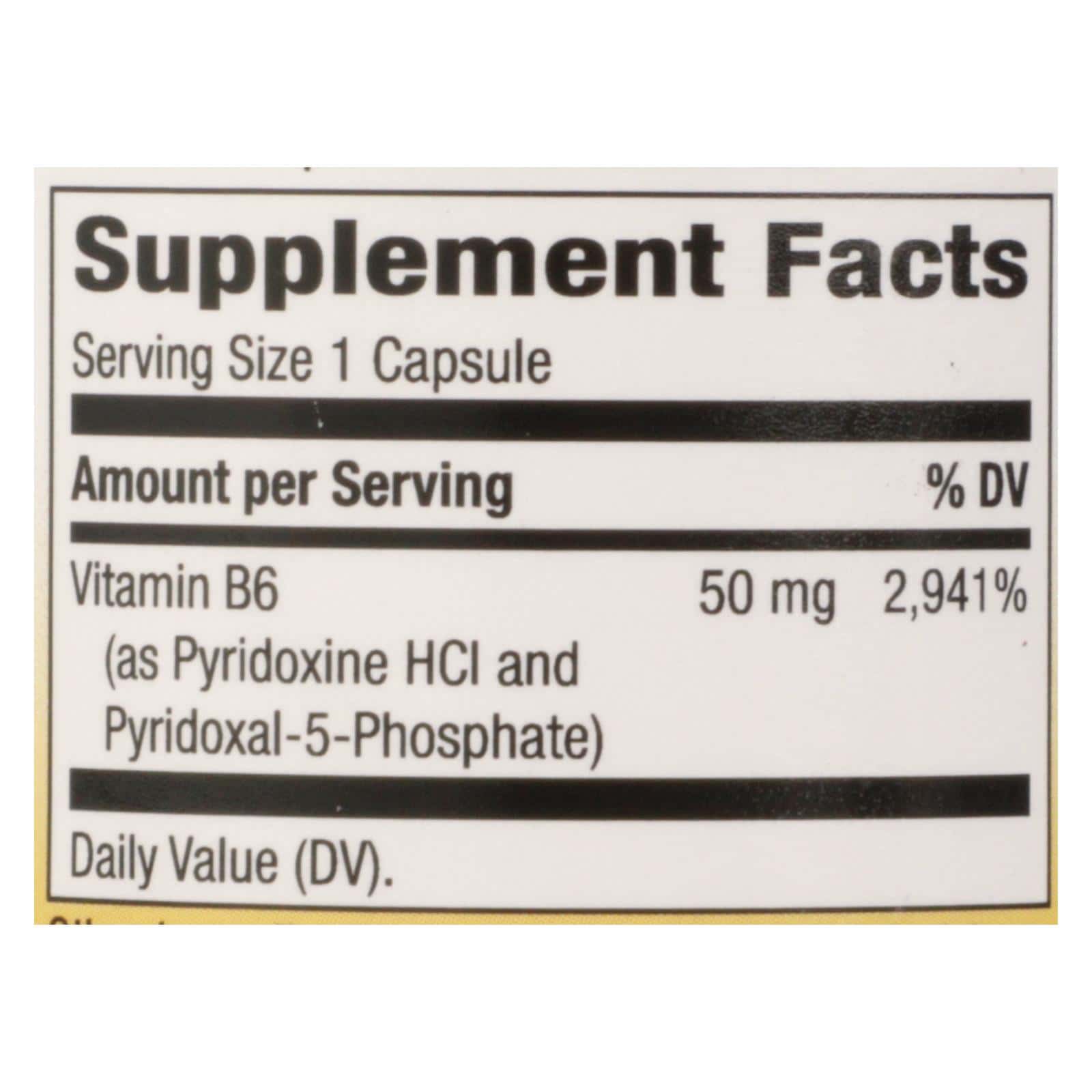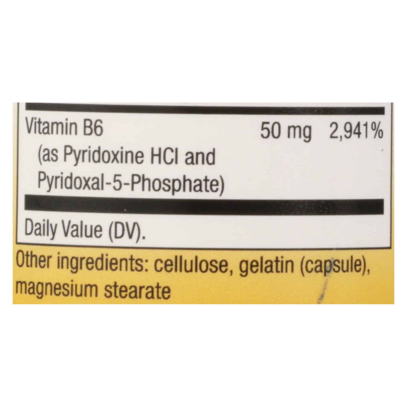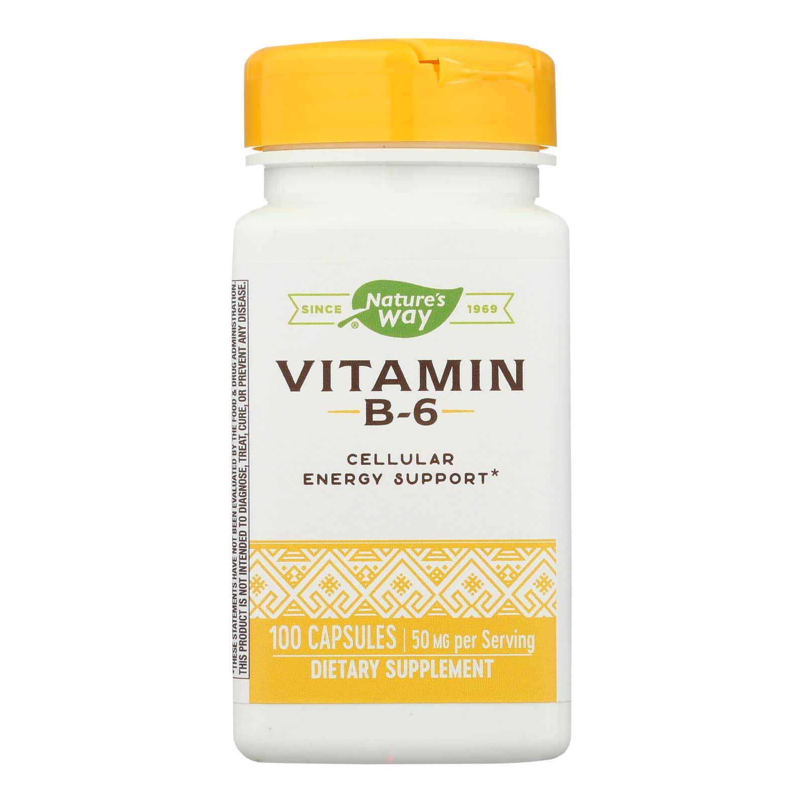 NATURE’S WAY VITAMIN B-6 DIETARY SUPPLEMENT PROVIDES 100 MG. OF VITAMIN B-6 AS PYRIDOXINE HCL TO HELP SUPPORT YOUR ENERGY LEVELS AND HEALTHY NERVOUS SYSTEM. VITAMIN B-6 IS ESSENTIAL FOR THE PRODUCTION OF SEROTONIN, AND YOUR BODY USES IT FOR AMINO ACID AND PROTEIN METABOLISM. THIS BOTTLE CONTAINS 100 VITAMIN B-6 CAPSULES MADE WITHOUT SUGAR, SALT AND COMMON FOOD ALLERGENS.