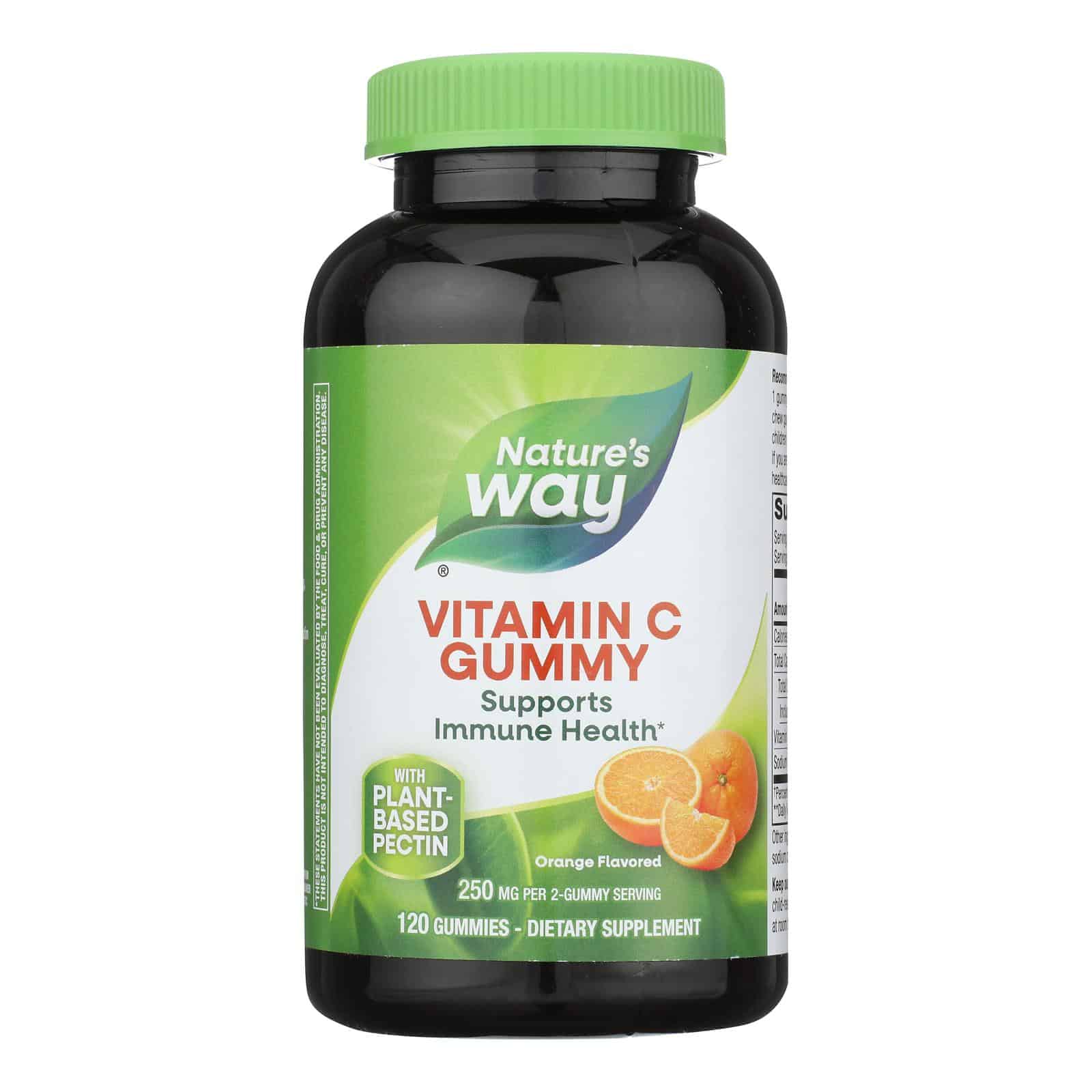 Dietary Supplement. 250 mg per 2 gummy serving. Gluten free. No yeast-derived ingredients, wheat, or dairy. Vegan. Since 1969. Supports immune health. Vitamin C is an essential antioxidant for a healthy immune system. These high potency, pectin-based gummies are formulated with nearly three times the recommended daily value of vitamin C per 2 gummy serving. And their vibrant orange flavor is deliciously juicy. naturesway.com. Questions? 1-800-9NATURE / naturesway.com. (These statements have not been evaluated by the Food & Drug Administration. This product is not intended to diagnose, treat, cure, or prevent any disease.) Quality Global Sourcing: Bottled & tested in the USA.