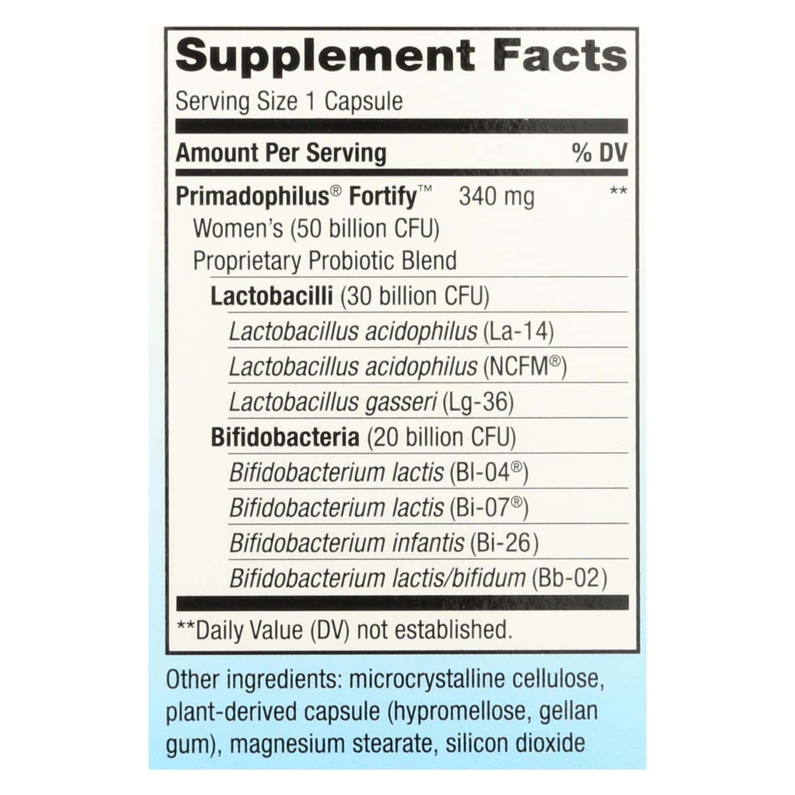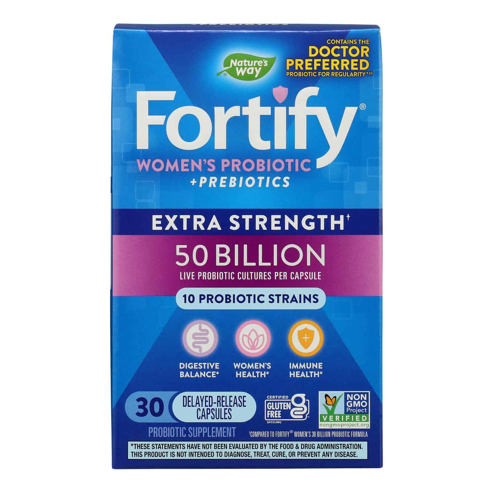 NATURE’S WAY WOMEN’S 50 BILLION PROBIOTIC SUPPLEMENT CONTAINS LIVE PROBIOTIC CULTURES THAT ARE BALANCED FOR A WOMAN’S NEEDS. OUR VEGETARIAN CAPSULES ARE DELAYED-RELEASE TO HELP DELIVER PROBIOTICS TO THE INTESTINE. WE INCLUDE NO ARTIFICIAL PRESERVATIVES IN OUR SUPPLEMENT. EACH PROBIOTIC SUPPLEMENT CONTAINS THIRTY CAPSULES.