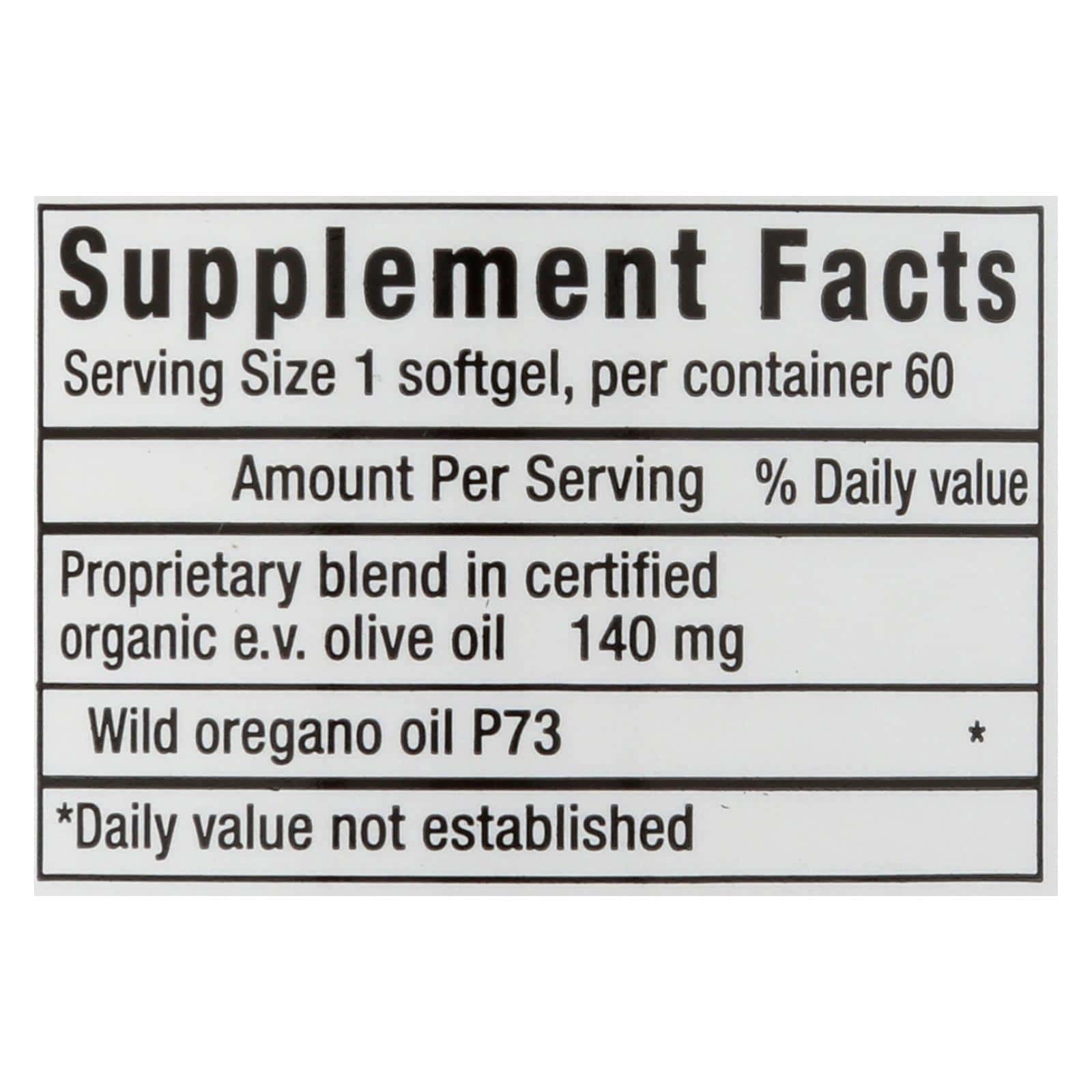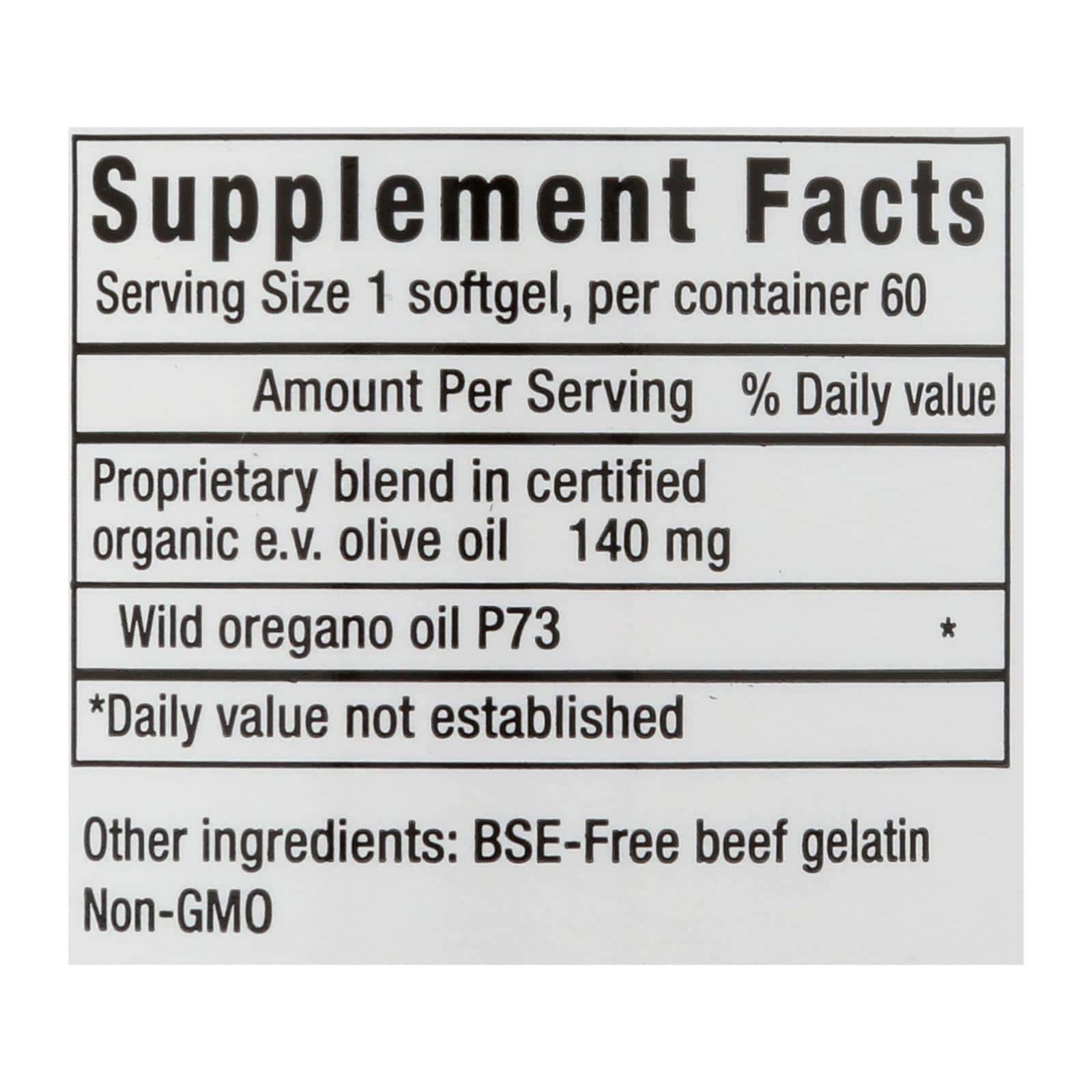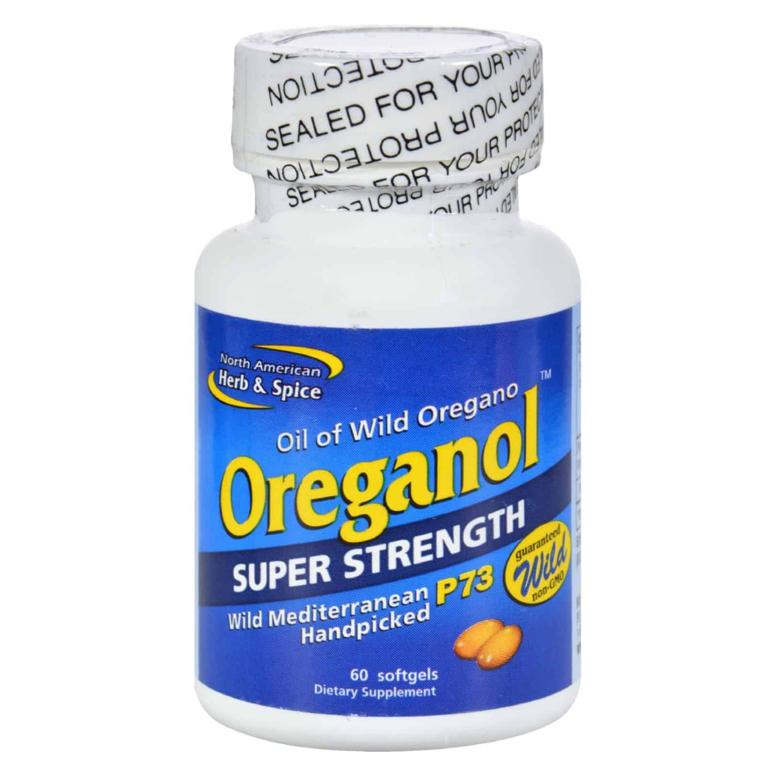 Dietary Supplement. Oil of wild oregano. Wild Mediterranean handpicked. Guaranteed wild non-GMO. NAH&S was the first to develop an edible oregano oil blend – all others are imitations. Oreganol P73 Super Strength is made from the original wild, high-mountain Mediterranean oregano. It is handpicked from remote, pristine regions which are pollution and pesticide free. Oreganol P73 Super Strength is more powerful (increased wild oregano oil per mg weight) than regular strength. Softgels made from 100% beef gelatin (BSE free) non-GMO. www.oreganol.com. (These statements have not been evaluated by the Food and Drug Administration. This product is not intended to diagnose, treat, cure, or prevent any disease.)