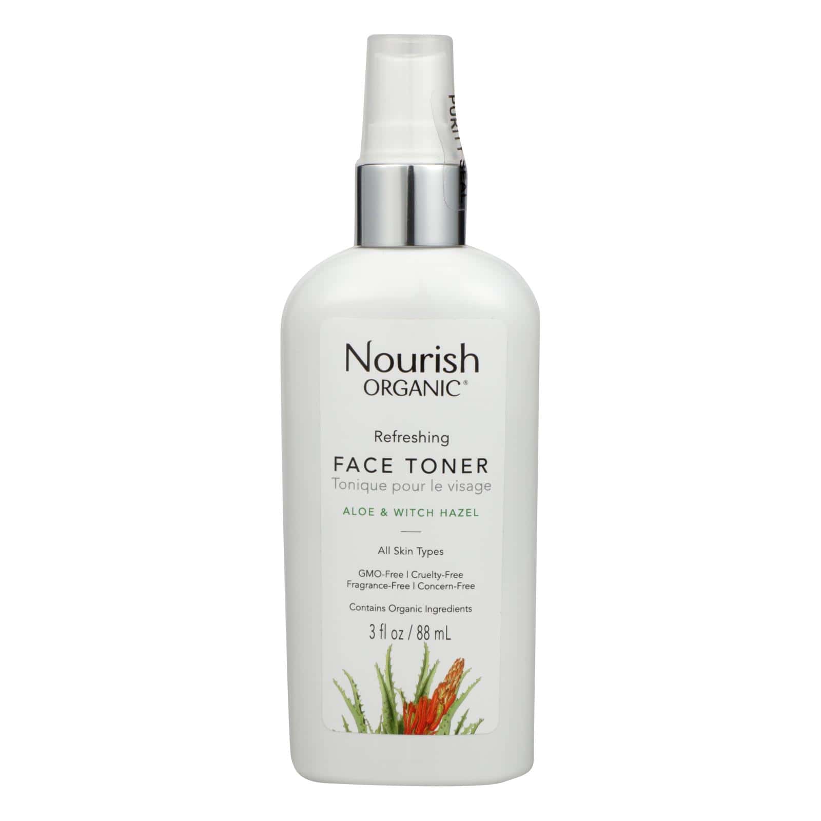 NOURISH ORGANIC FACE TONER, NORMAL TO DRY SKIN IS AN ALCOHOL-FREE FORMULA THAT PURIFIES SKIN WITHOUT EVER DRYING. ROSEWATER SOOTHES AND BALANCES SKIN FOR A HEALTHIER COMPLEXION, WHILE WITCH HAZEL REMOVES IMPURITIES WITHOUT STRIPPING SKIN OF ESSENTIAL MOISTURE. SPRAY LIBERALLY ONTO CLEAN SKIN BEFORE MOISTURIZER USE. THIS TONER HAS A 3 FL. OZ. PER BOTTLE.