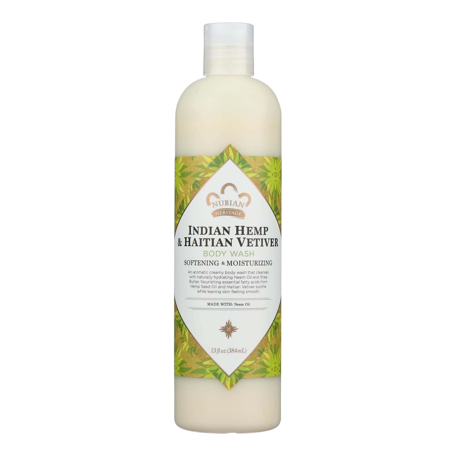 NUBIAN HERITAGE INDIAN HEMP & HAITIAN VETIVER BODY WASH IS AN AROMATIC CREAMY BODY WASH THAT CLEANSES WITH NATURALLY HYDRATING NEEM OIL AND SHEA BUTTER. NOURISHING ESSENTIAL FATTY ACIDS FROM HEMP SEED OIL AND HAITIAN VETIVER SOOTHE WHILE LEAVING SKIN FEELING SMOOTH. THIS BODY WASH USES ETHICALLY TRADED INGREDIENTS, IS SUSTAINABLY PRODUCED, DOESN?T USE ANIMAL TESTING AND COMES IN A 13 FL. OZ. BOTTLE.