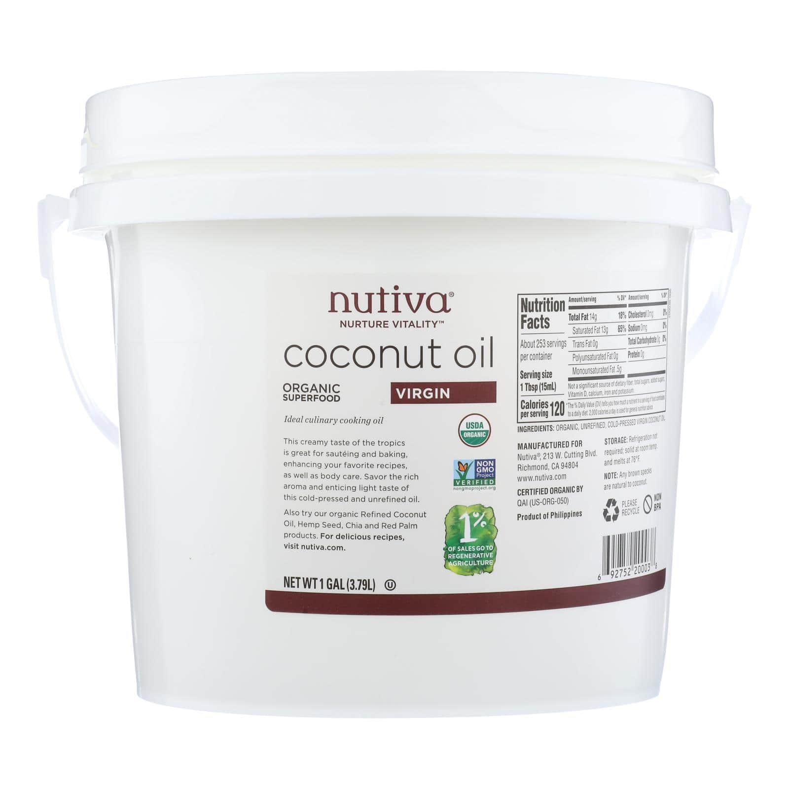 NUTIVA VIRGIN COCONUT OIL IS A TASTY ALTERNATIVE TO BUTTER FOR BAKING AND PREPARING YOUR FOODS. OUR COCONUT OIL IS CHOLESTEROL-FREE AND INCLUDES MEDIUM-CHAIN “GOOD FATS” FOR HEART-HEALTHY COOKING. THIS OIL IS ALSO PERFECT FOR SKIN AND HAIR CARE OR AS USE AS A MASSAGE OIL. WE USE CERTIFIED KOSHER INGREDIENTS TO CREATE THIS SOCIALLY RESPONSIBLE COCONUT OIL. THIS TUB CONTAINS 1 GAL. OF VIRGIN COCONUT OIL.
