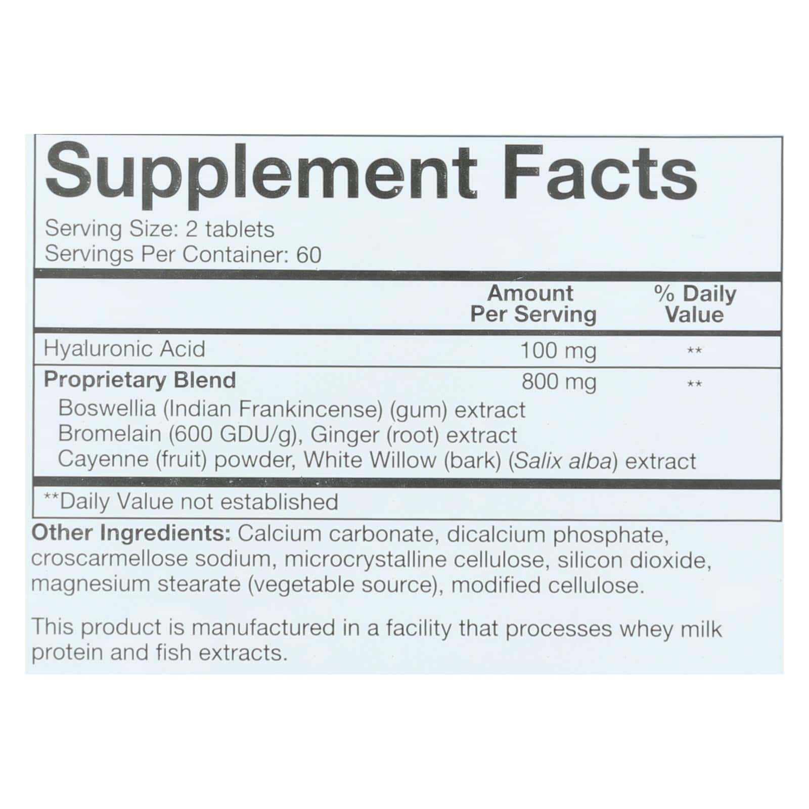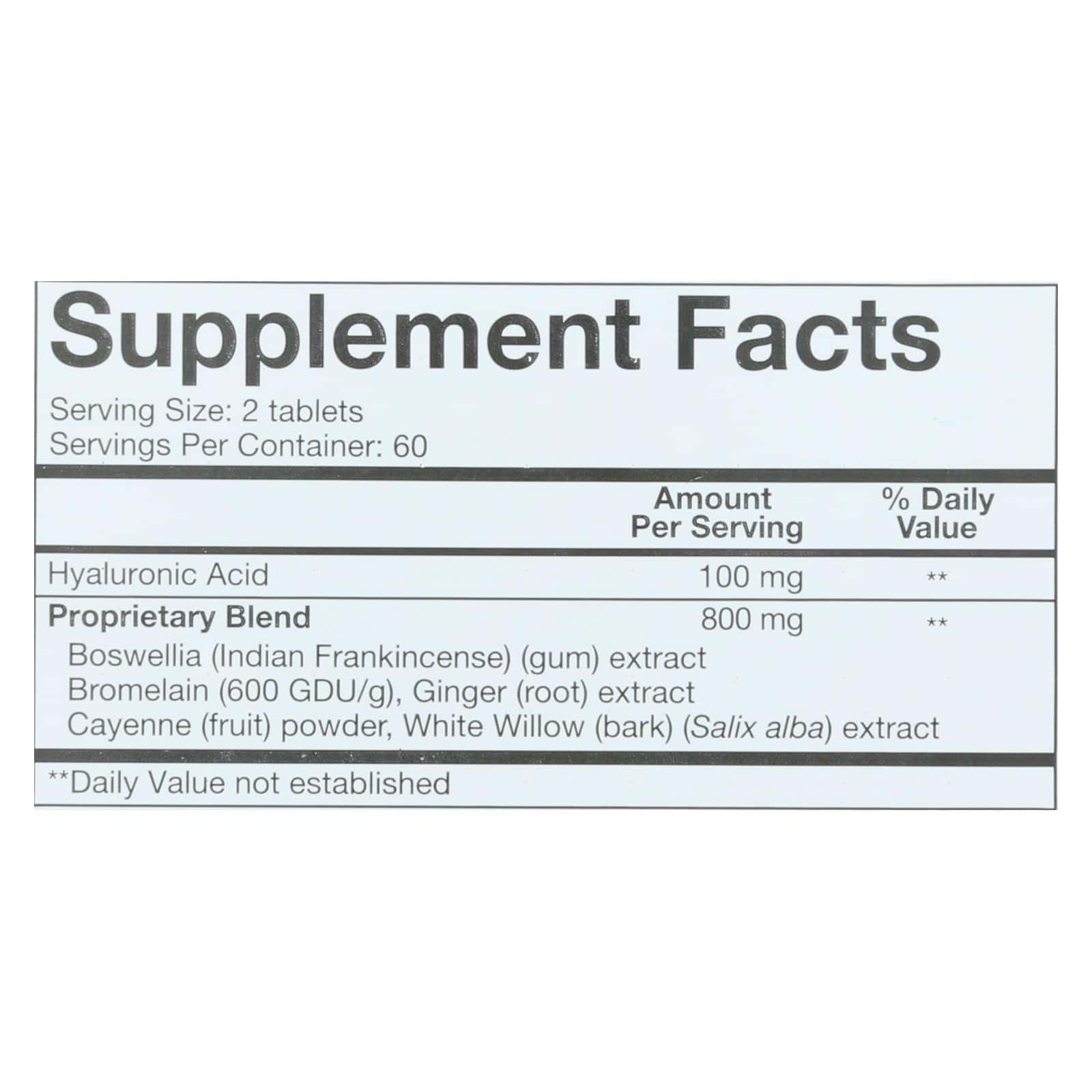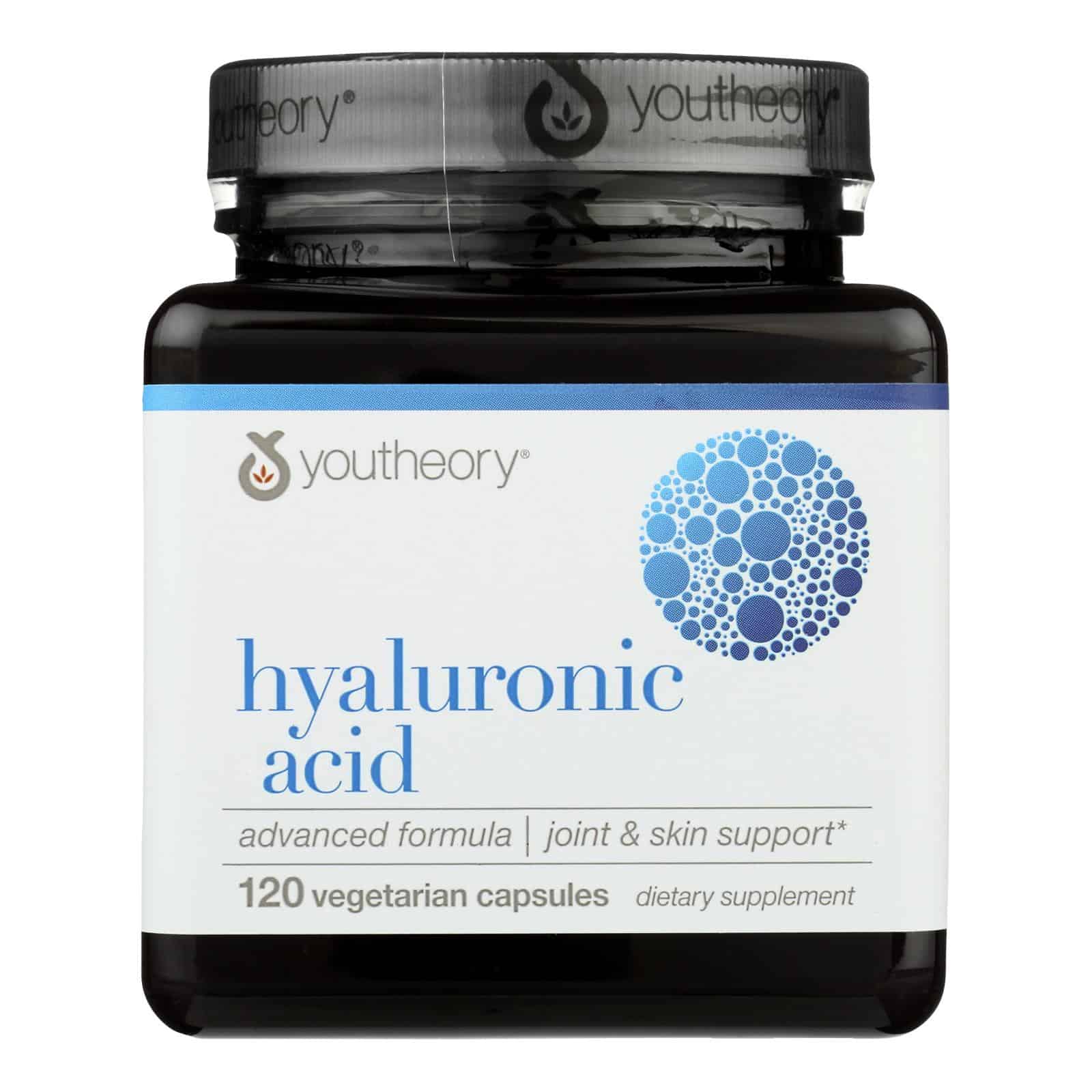 ONE SERVING SIZE OF YOUTHEORY HYALURONIC ACID ADVANCED CONTAINS 100 MG. OF HYALURONIC ACID, WHICH IS A VITAL COMPONENT OF THE HUMAN BODY. HYALURONIC ACID IS A “WATER-LOVING” MOLECULE FOUND ABUNDANTLY IN JOINTS, SKIN AND CONNECTIVE TISSUE. EACH BOTTLE OF YOUTHEORY HYALURONIC ACID ADVANCED CONTAINS 120 TABLETS, FOR BEST RESULTS, TAKE TWO TABLETS TWICE PER DAY. CONSULT LABEL FOR MEDICAL WARNING INFORMATION.