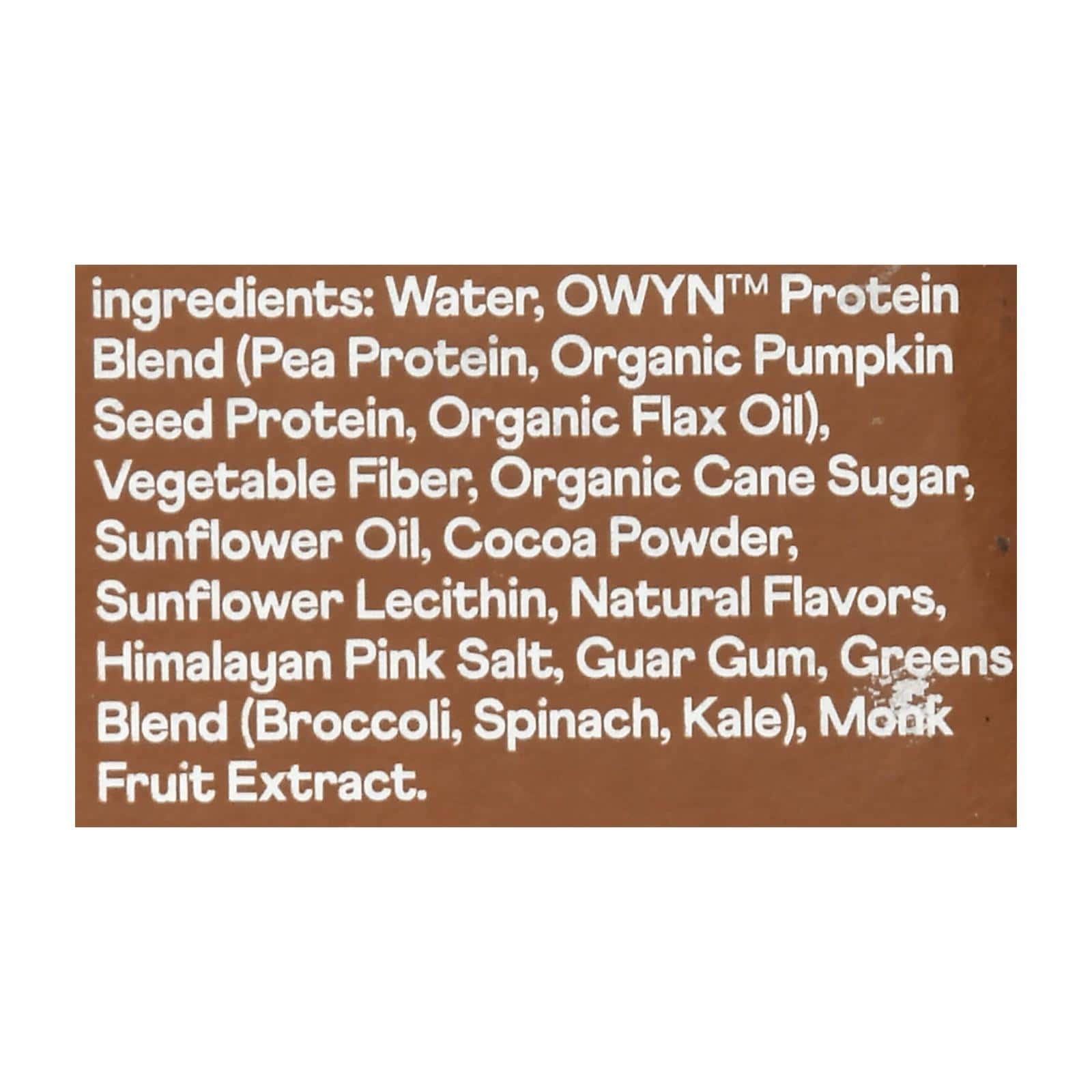 20 g protein. 4 g net carbs. Certified Gluten-free. Certified Vegan. vegan.org. Low sugar content. Non GMO Project verified. nongmoproject.org. We milk plants, not cows. Allergy Friendly. What’s inside matters. Only What You Need: 500 mg omega 3s. Greens blend. Essential amino acids. Nothing You Don’t: Dairy, wheat/gluten, soy, egg, peanuts, nuts, fish, shellfish, chemicals, fillers, artificial junks, sugar alcohols. Free from the top 8 allergens. Tested for top 8 allergens. OWYN’s ingredients and finished products are independently tested for detection of the top 8 allergens every lot, every time. Nothing but the truth. Good source of fiber. This is a snack. liveowyn.com. nongmoproject.org. vegan.org. Instagram. Facebook. (at)liveowyn. Questions, comments or more info visit liveowyn.com. FARE: Food Allergy Research & Education National Strategic Partner.
