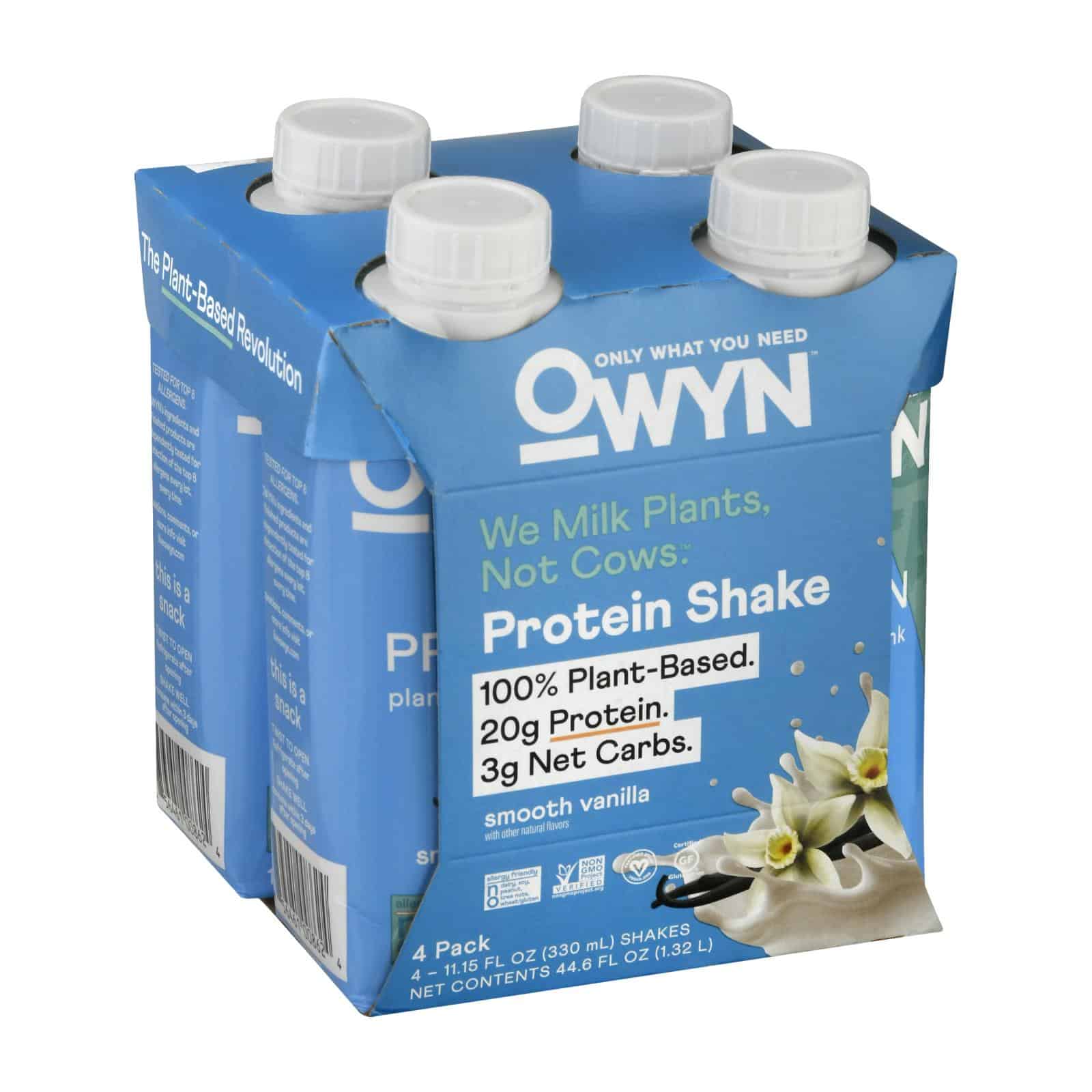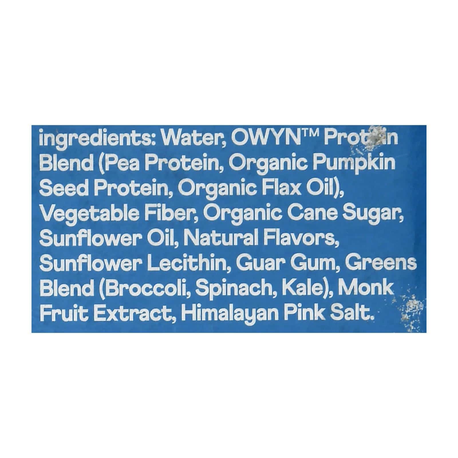 Smooth vanilla with other natural flavors. 3 net carbs per serving. Certified Vegan. vegan.org. Certified Gluten-Free. Low sugar content. Non GMO Project verified. nongmoproject.org. Only What You Need. We milk plants not cows. What’s inside matters. Greens blend. Nothing You Don’t: dairy, wheat/gluten, soy; egg, peanuts, nuts, fish, shellfish, chemicals, fillers, artificial junk, sugar alcohols. Free from the top 8 allergens. The plant-based revolution. Tested for top 8 allergens. OWYN’s ingredients and finished products are independently tested for detection of the top 8 allergens every lot, every time. This is a snack. 500 mg Omega 3s. Good source of fiber. Essential amino acids. liveowyn.com. nongmoproject.org. vegan.org. Instagram. Facebook. (at)liveowyn. Questions, comments, or more info visit liveowyn.com. Fare: Food Allergy Research & Education. National strategic partner.