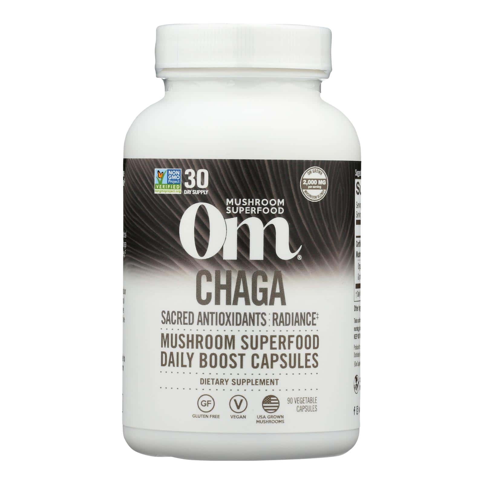 Dietary Supplement. Sacred antioxidants. Radiance. Mushroom superfood daily boost capsules. 2,000 mg per serving. Vegan. Gluten free. Non GMO Project verified. nongmoproject.org. Certified kosher by EarthKosher. Mushroom superfood. Youthful radiance. Antioxidant support. 30 day supply. Om Chaga. The Radiance Mushroom: Chaga can help promote healthy skin by warding off free radical damage and supporting a youthful radiance. We love Om Chaga capsules in the evening to help supercharge our beauty sleep. Why Mushrooms? Did you know? Mushrooms are truly a unique superfood. They contain many bioactive nutrients that we have a hard time getting from plant or animal sources. Each serving of Om provides 2,000mg of Mushroom Power: super antioxidants; beta glucans and prebiotics; no added sugars or fillers. Powered by Om: At Om, we grow functional mushrooms at our indoor farm in California. They contain a full spectrum of active compounds, the way nature intended. We believe in the power of the whole food mushroom and its full array of benefits to support optimal health. Expertly crafted to elevate the mind and body, we’ve harnessed the benefits of the mushroom kingdom in a convenient daily boost capsule. Enjoy and feel Om-Azing! No synthetic or artificial ingredients. Tested for heavy metals. Mushroom identity guaranteed. Find your Om at ommushrooms.com. Instagram. Facebook. Twitter. (These statements have not been evaluated by the Food and Drug Administration. This product is not intended to diagnose, treat, cure, or prevent any disease.) USA grown mushrooms.