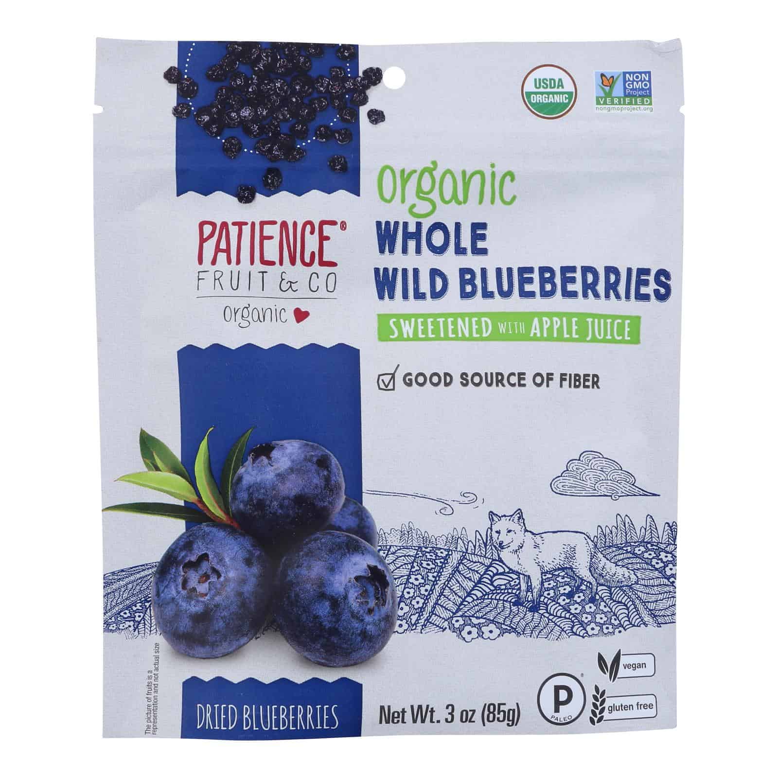 PATIENCE FRUIT & CO ORGANIC DRIED WILD BLUEBERRIES SATISFY YOUR CRAVING FOR A WHOLESOME SNACK. WE INFUSE THESE WHOLE SLOW-GROWN DRIED BLUEBERRIES WITH REAL APPLE JUICE CONCENTRATE FOR A SOFT, JUICY BITE AND A LIGHTLY SWEET FLAVOR. EACH 3 OZ. BAG PROVIDES ABOUT TWO 1/4 OZ. SERVINGS, AND YOU GET 190 MG. OF HEALTH-BOOSTING POLYPHENOLS AND 3 G. OF DIETARY FIBER WITH EACH SERVING. OUR BLUEBERRIES ARE COMPLETELY FREE OF SULFITES AND ADDITIVES SO YOU CAN ENJOY THE NATURAL FLAVORS.