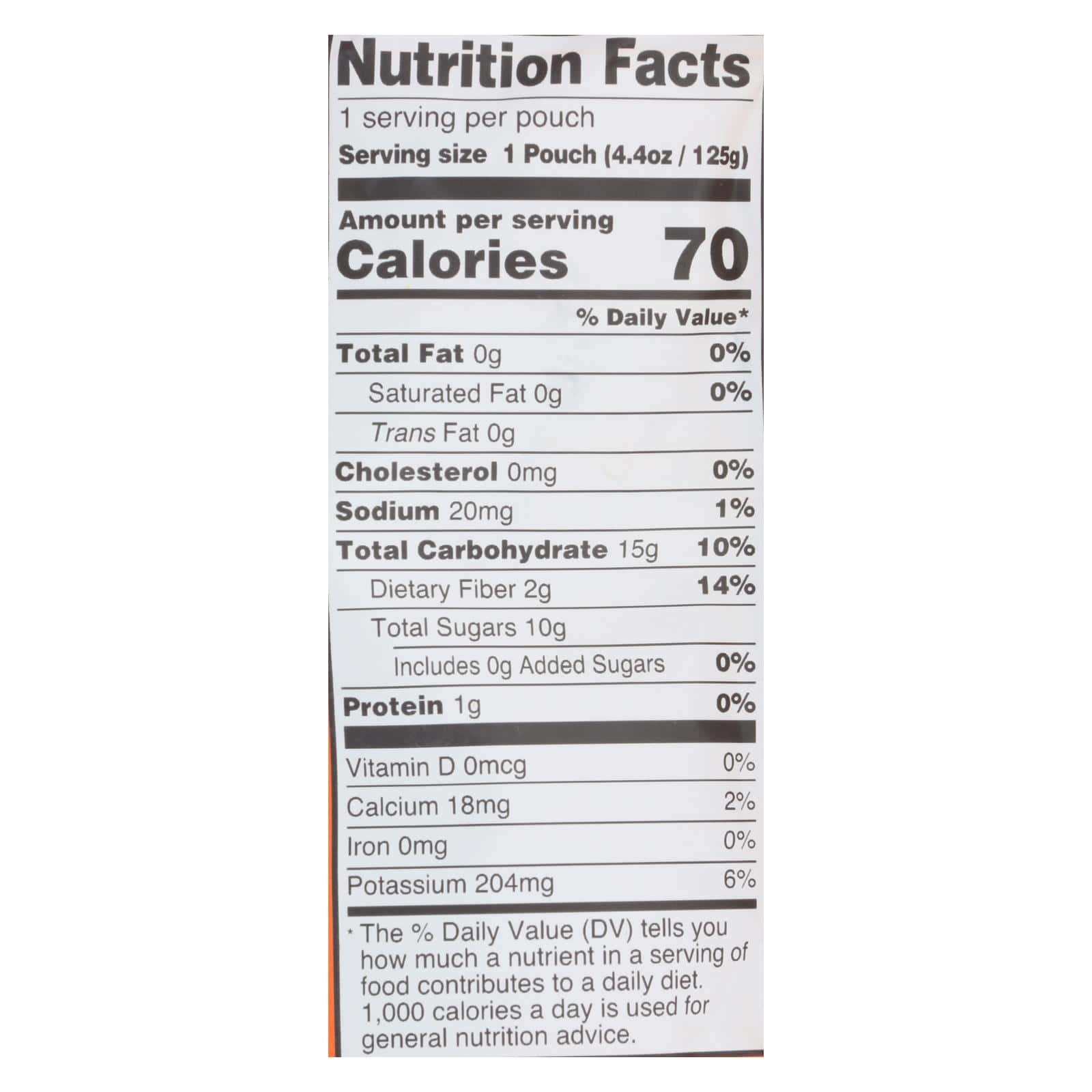 PUMPKIN TREE ORGANICS?PUMPKIN, CARROT & APPLE SNACK IS USDA ORGANIC CERTIFIED AND MADE FROM PURE FRUITS AND VEGETABLES. EVERY 4.4 OZ. POUCH OF PUMPKIN, CARROT & APPLE IS MADE WITHOUT ADDED SALT, SUGAR OR WATER. A 1-POUCH SERVING PROVIDES 3 G. OF FIBER, 50% OF THE DAILY RECOMMENDED VALUE OF VITAMIN C AND 80 PERCENT OF THE DAILY RECOMMENDED VALUE OF VITAMIN A.