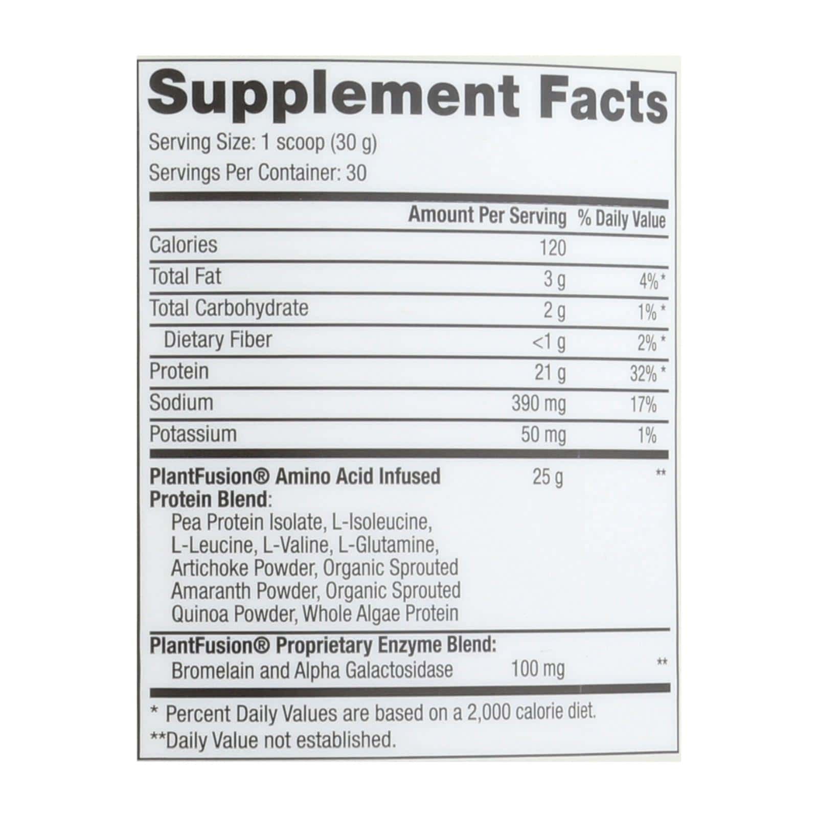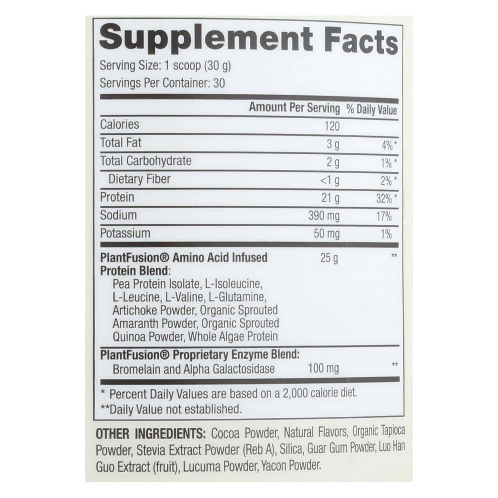 PLANTFUSION CHOCOLATE COMPLETE PLANT PROTEIN IS OUR EASY-TO-DIGEST GOURMET FLAVOR SOLUTION TO PROTEIN. EACH SERVING PROVIDES 21 G. OF PLANT PROTEIN AND WILL MAKE YOU LOOK FORWARD TO EVERY SHAKE. OUR PRODUCT IS GLUTEN-FREE AND NON-GMO. LASTLY, OUR PRODUCT IS COMPLETELY VEGAN AND CONTAINS NO ARTIFICIAL PRESERVATIVES OR FLAVORS. INCLUDED IS ONE 2 LBS. CONTAINER OF PLANTFUSION CHOCOLATE COMPLETE PLANT PROTEIN.