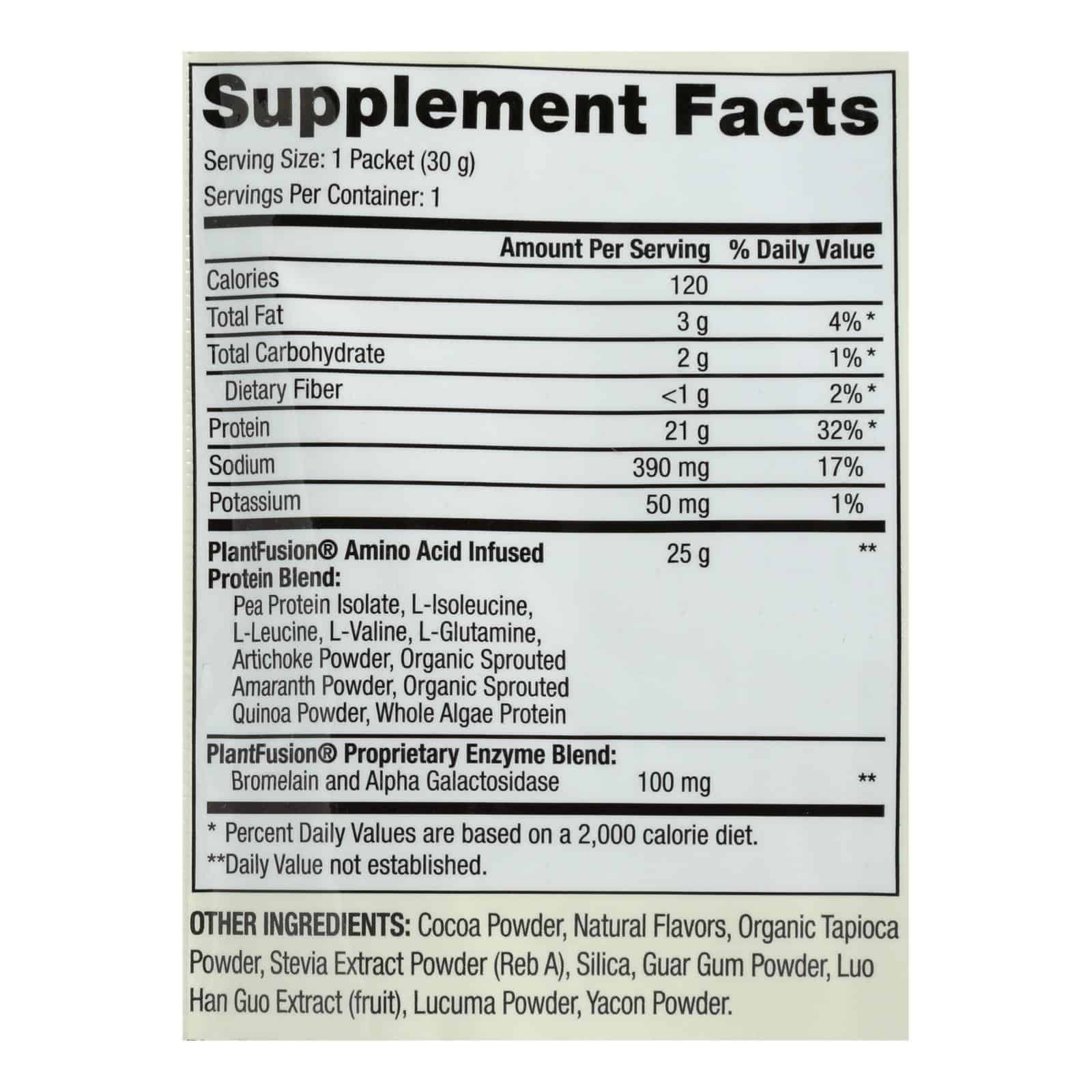 PLANTFUSION COMPLETE PLANT PROTEIN CHOCOLATE PACKETS ARE OUR EASY-TO-DIGEST GOURMET FLAVOR SOLUTION TO PROTEIN. EACH PACKET PROVIDES 21 G. OF PLANT PROTEIN AND WILL MAKE YOU LOOK FORWARD TO EVERY SHAKE. OUR PRODUCT IS GLUTEN-FREE AND NON-GMO. ADDITIONALLY, OUR PRODUCT IS COMPLETELY VEGAN AND CONTAINS NO ARTIFICIAL PRESERVATIVES OR FLAVORS. INCLUDED IS ONE 30 G. PACKET OF PLANTFUSION COMPLETE PLANT PROTEIN CHOCOLATE PACKETS.