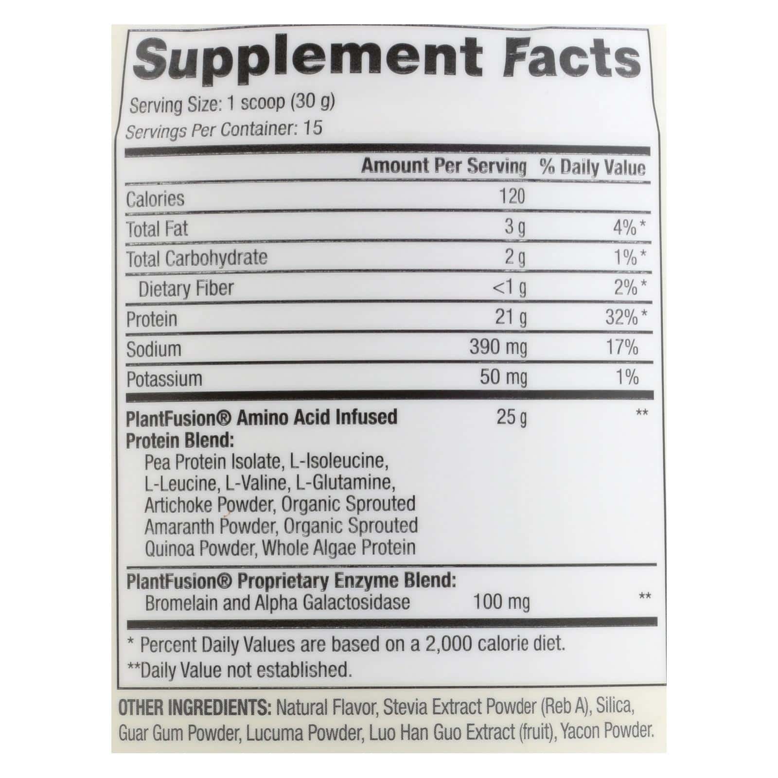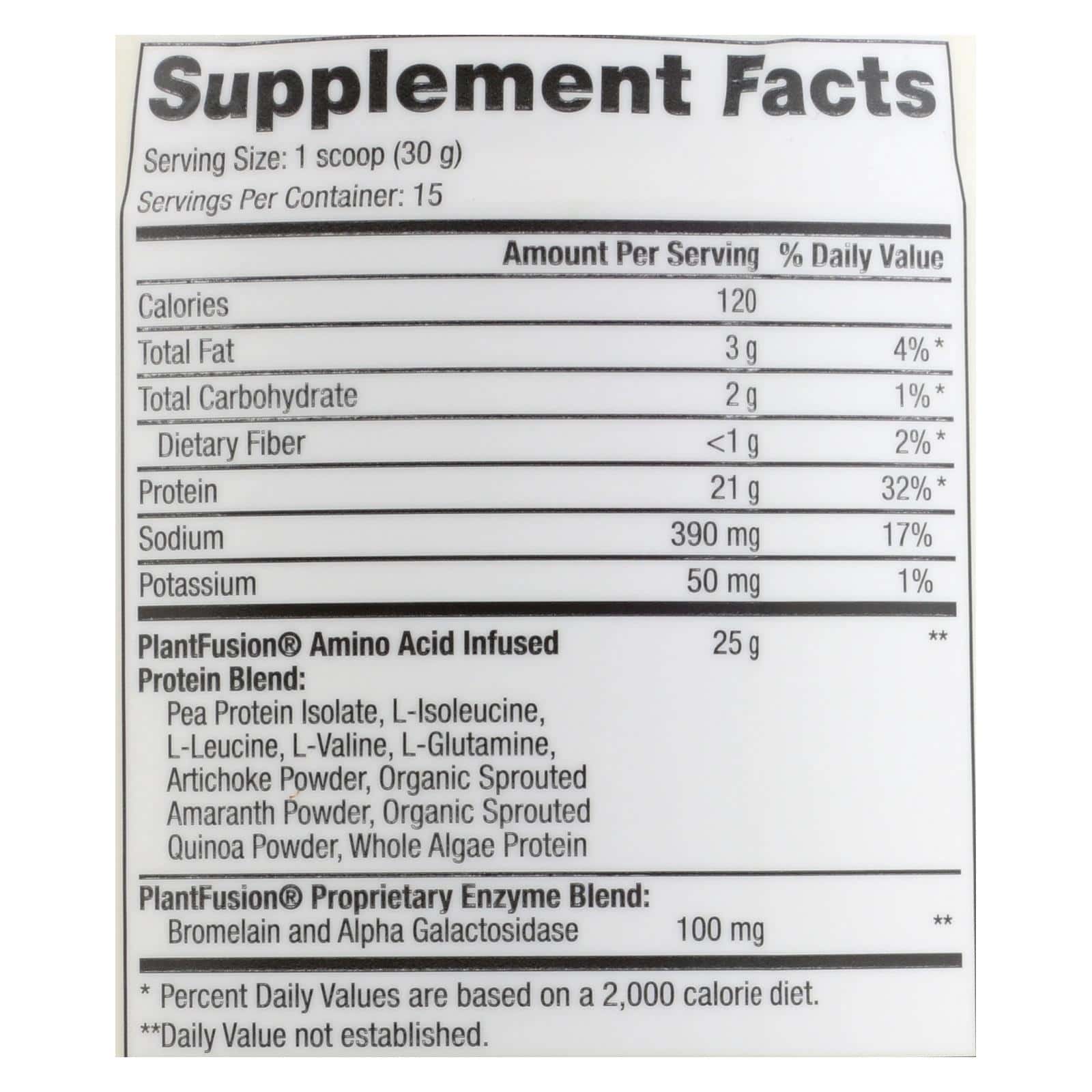 PLANTFUSION COMPLETE VANILLA IS OUR EASILY DIGESTIBLE PLANT PROTEIN SHAKE MIX MADE FROM NATURE’S INGREDIENTS. OUR PRODUCT IS PACKED WITH 21 G. OF PROTEIN PER SERVING AND IS VEGAN AND GLUTEN-FREE. ADDITIONALLY, OUR PRODUCT IS NON-GMO AND CONTAINS NO PRESERVATIVES OR ARTIFICIAL FLAVORS. INCLUDED IS ONE 1 LB. CONTAINER OF PLANTFUSION COMPLETE VANILLA.