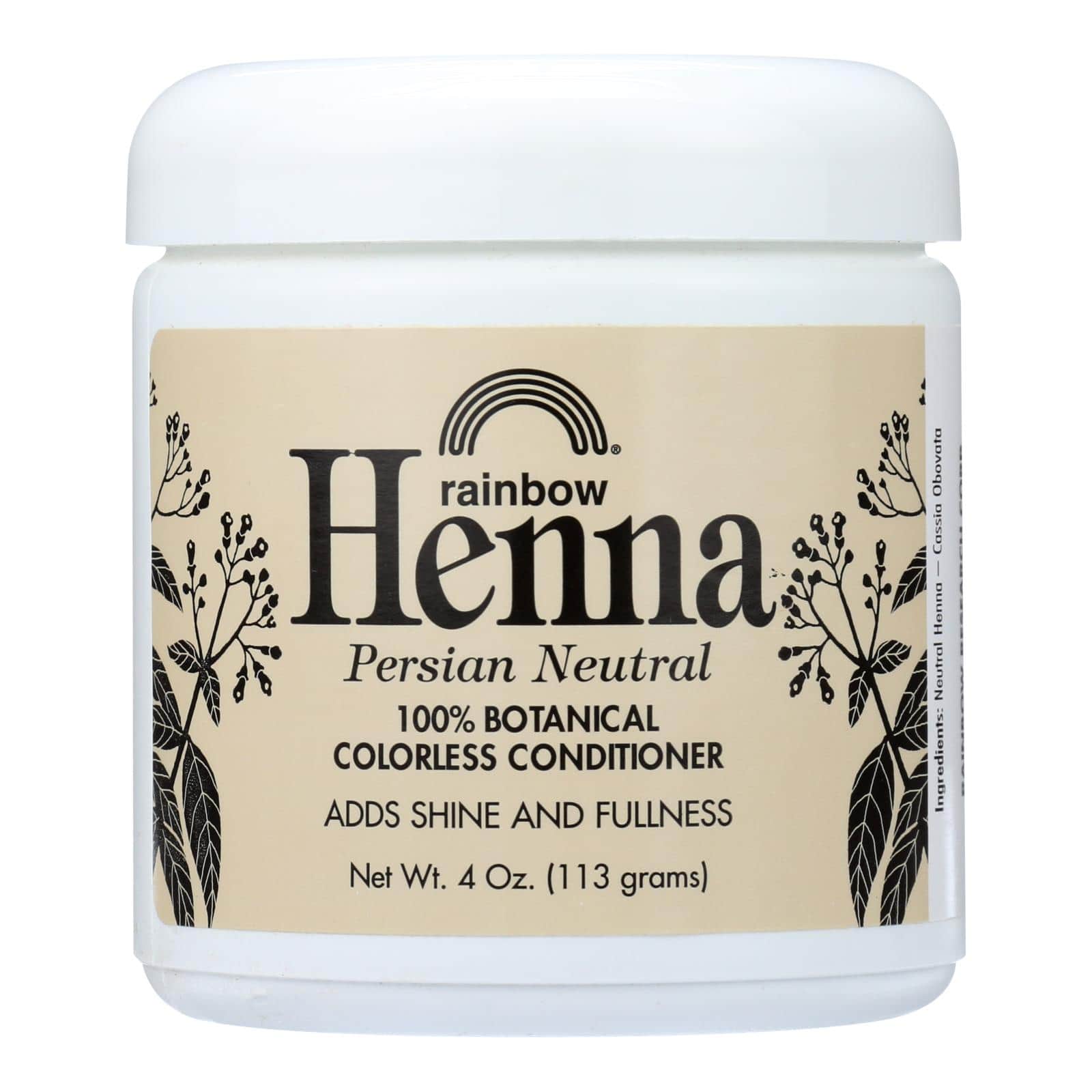RAINBOW RESEARCH PERSIAN NEUTRAL HENNA COLORLESS CONDITIONER HAS NO CHEMICALS OR PRESERVATIVES, SO IT PAMPERS YOUR HAIR. USE THIS PRODUCT ON YOUR TRESSES AND EXPERIENCE THE BENEFITS OF 100% ORGANIC HENNA. NOTICE YOUR HAIR?S FULLNESS, SHINE AND SMOOTHNESS, WITH THE EFFECTS LASTING FOUR TO SIX WEEKS. WE’VE PACKED THIS HENNA CONDITIONER IN A 4 OZ. JAR.