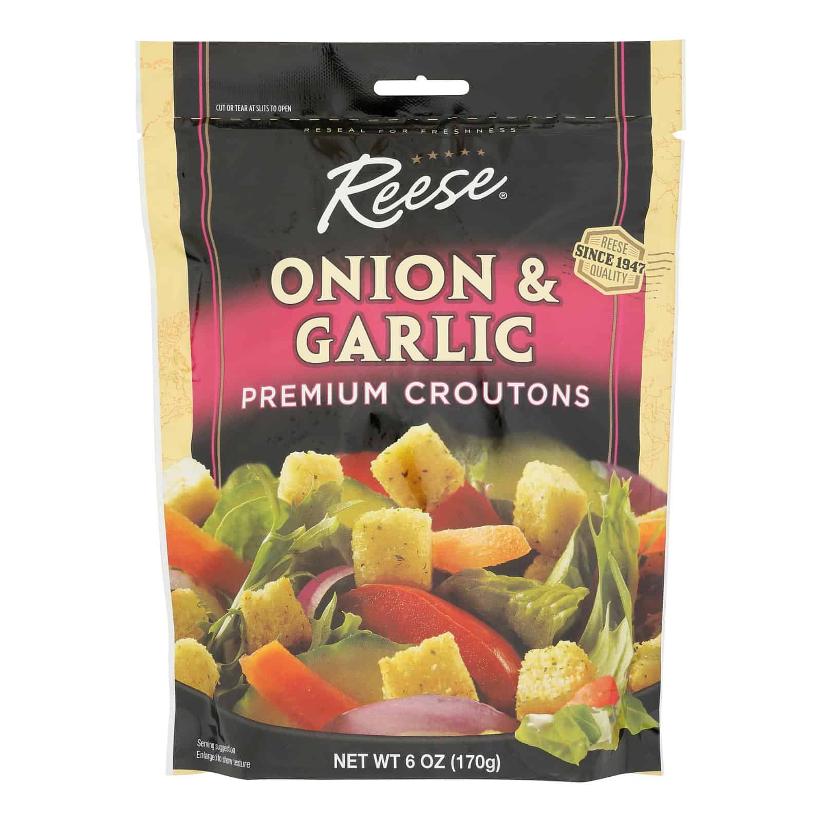 REESE’S CROUTONS IN?ONION?&?GARLIC?FLAVOR ARE A SEASONED TOPPING THAT GIVES SALADS, SOUPS AND CASSEROLES A SAVORY TASTE. OUR 6 OZ. PACKET OF SMALL-CUT PREMIUM CROUTONS ARE MADE FROM SPECIALLY FORMULATED DOUGH THAT ALLOWS THEM TO RETAIN THE CRISPNESS AND FLAVOR THAT CROUTON LOVERS SEEK. SEE NUTRITION FACTS PANEL FOR ALLERGENS.