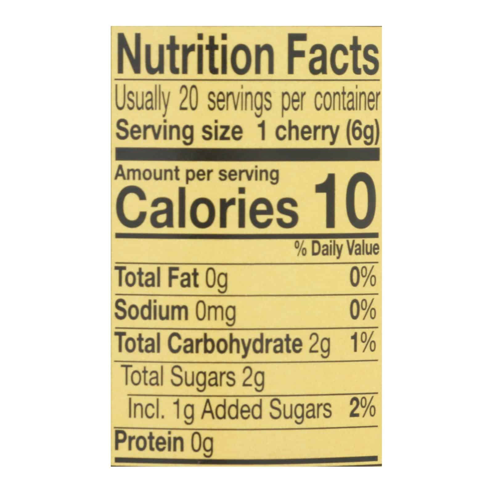 REESE RED MARASCHINO CHERRIES WITH STEMS ARE A LOW-CALORIE, PASTEURIZED SELECTION OF SWEET AND DELICIOUS CHERRIES. EACH SERVING OF THIS HEALTHY SNACK CONTAINS ONLY 10 CALORIES AND 2 G. OF SUGAR. OUR PRODUCT IS ALSO KOSHER-PARVE AND FREE OF FAT AND SODIUM. THIS 10 OZ. JAR OF CHERRIES INCLUDES 24 SERVINGS.
