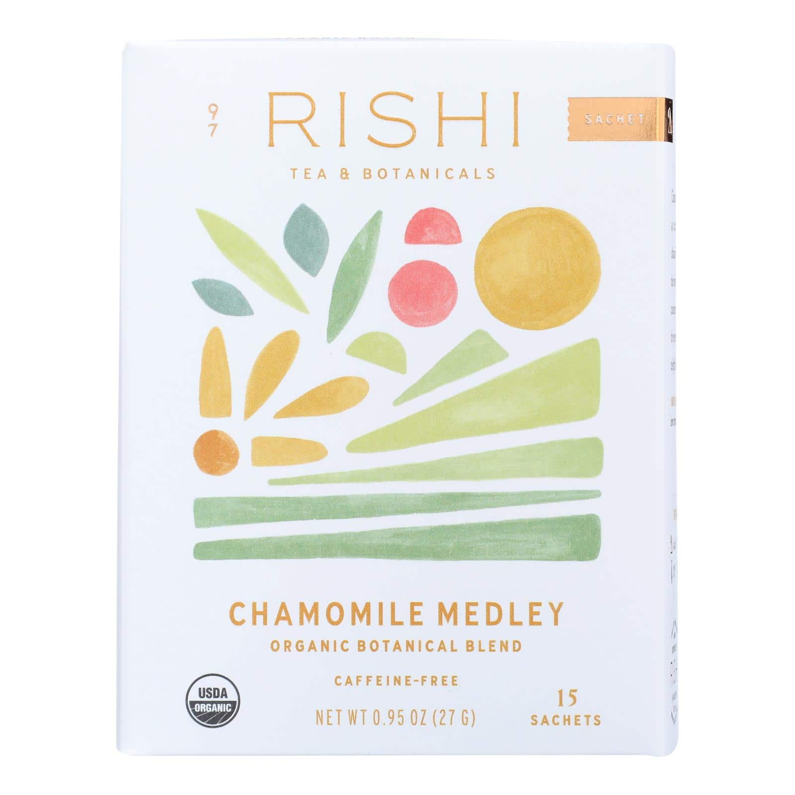 RISHI TEA RETAIL SACHET, CHAMOMILE MEDLEY IS ORGANIC HERBAL TEA THAT OFFERS A HONEY-LIKE SWEETNESS WITH SUBTLE, SOOTHING COUNTERPOINTS OF CITRUS-SCENTED HERBS. EACH BOX OF 15 BAGS IS MADE WITH IMPORTED CHAMOMILE FROM EASTERN EUROPE AND IS CERTIFIED USDA ORGANIC, NON-GMO AND KOSHER. THIS CAFFEINE-FREE BLEND IS INFUSED WITH LEMONGRASS, LEMON VERBENA AND SPEARMINT.