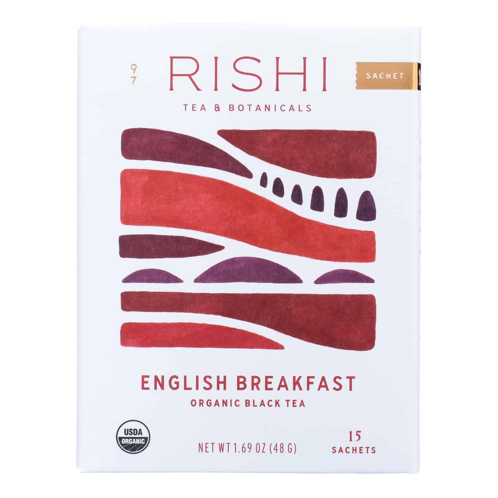 RISHI TEA RETAIL TEA SACHET, ENGLISH BREAKFAST IS A FULL-BODIED BLACK TEA THAT DELIVERS A BRIGHT RED COLOR AND A BRISK FLAVOR. MADE WITH BLACK TEA IMPORTED FROM SOUTH AND SOUTHEAST ASIA, EACH BOX OF 15 TEA BAGS IS CERTIFIED USDA ORGANIC, NON-GMO AND KOSHER. UNLIKE COMMON PAPER TEA BAGS THAT TEND TO STRIP AWAY THE FLAVOR AND AROMA OF TEA, OUR NOVEL KNIT MATERIAL PROVIDES A TRUER INFUSION FOR A RICH, AROMATIC CUP.
