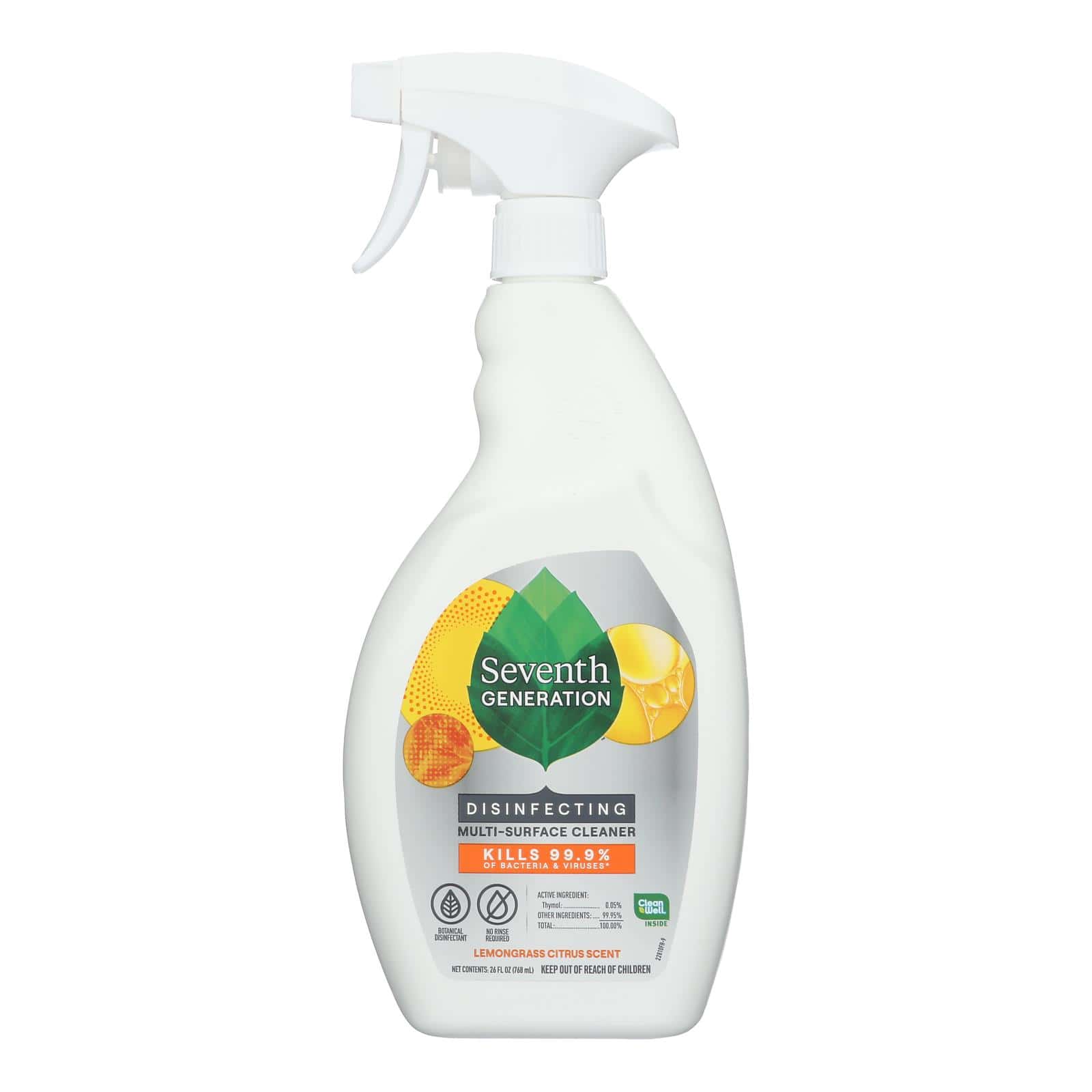SEVENTH GENERATION LEMONGRASS CITRUS MULTIPURPOSE CLEANER IS A CERTIFIED KOSHER-PARVE CLEANING PRODUCT. THIS MULTIPURPOSE CLEANER COMES IN ONE 26 FL. OZ. SPRAY BOTTLE AND IS A GLUTEN-FREE PRODUCT. IT EMPLOYS BOTANICAL DISINFECTANTS MADE FROM ESSENTIAL OILS, WITH THYMOL AS THE MAIN ACTIVE INGREDIENT.