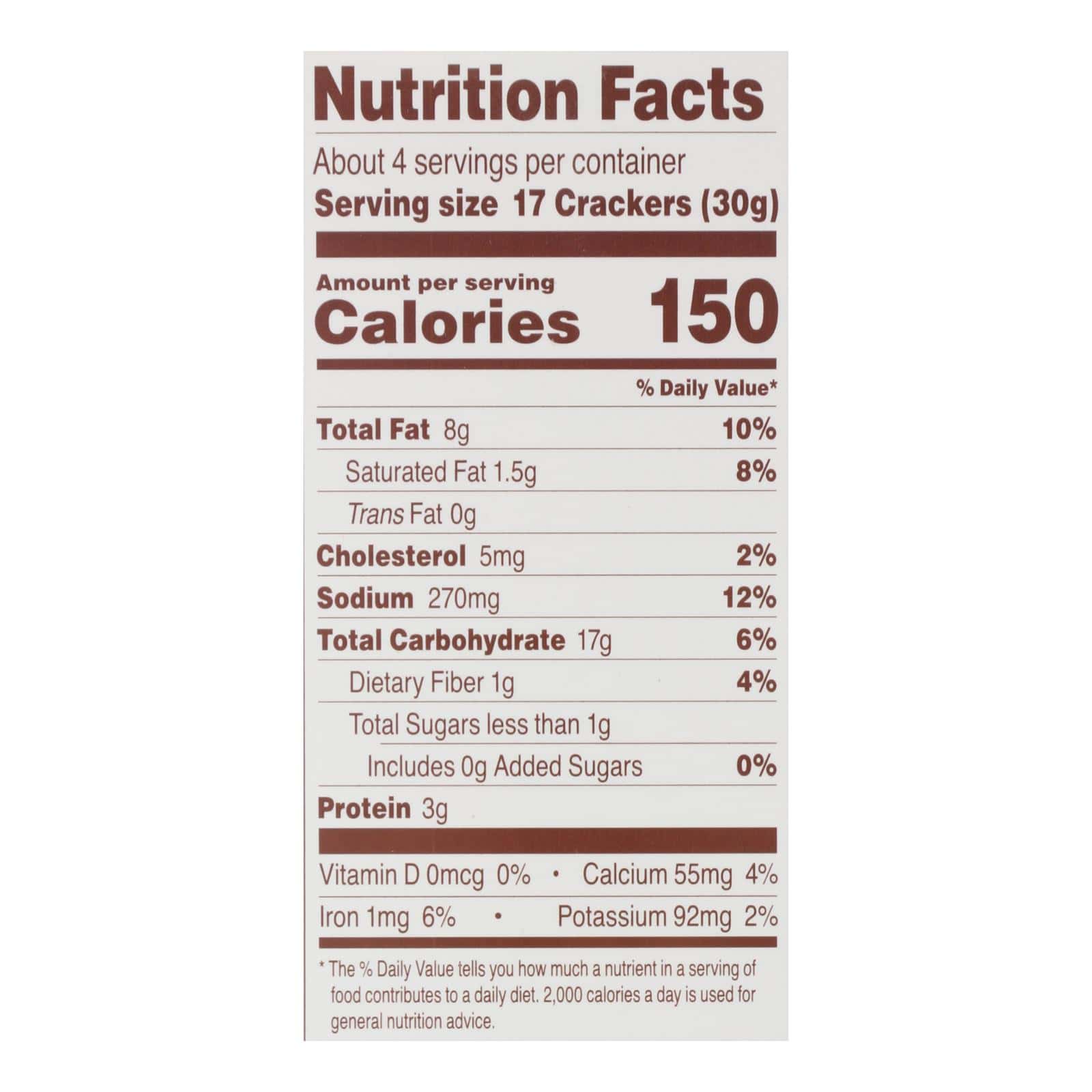 SIMPLE MILLS FARMHOUSE CHEDDAR ALMOND FLOUR CRACKERS ARE MADE WITH INGREDIENTS LIKE NUT AND SEED FLOUR BLEND, TAPIOCA, CASSAVA, ORGANIC CHEDDAR CHEESE, ORGANIC SUNFLOWER OIL, ORGANIC ONION, ORGANIC GARLIC, SEA SALT, PAPRIKA, ANNATTO EXTRACT AND ROSEMARY EXTRACT. EACH 4.25 OZ. BOX CONTAINS 4 SERVINGS OF ABOUT 17 CRACKERS EACH. EACH SERVING HAS 160 CALORIES, 4 G. OF PROTEIN AND 2 G. OF DIETARY FIBER.