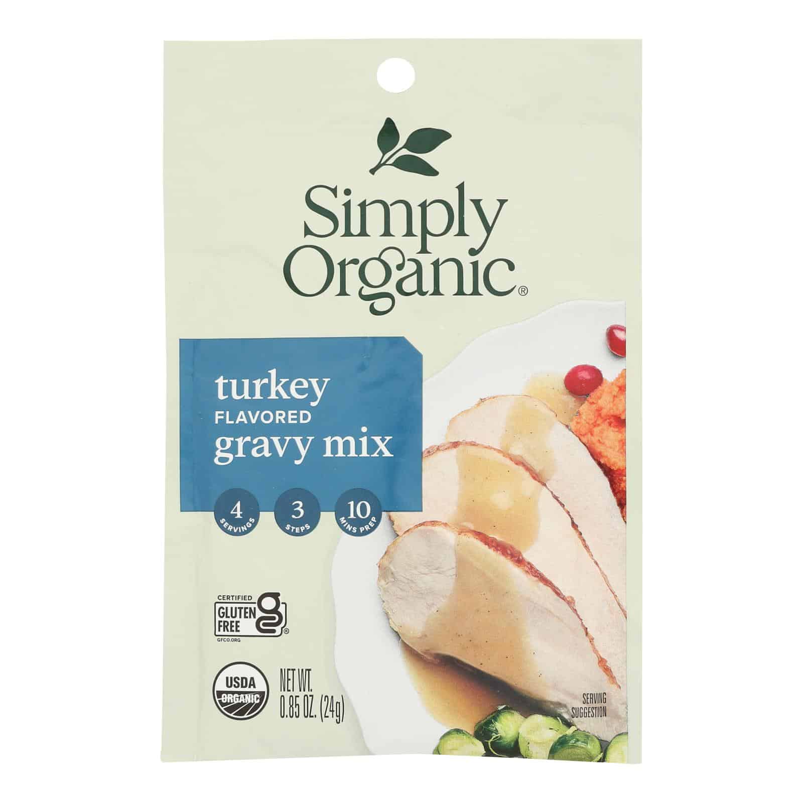 SIMPLY ORGANIC ROASTED TURKEY FLAVORED GRAVY SEASONING MIX IS A USDA-CERTIFIED ORGANIC SEASONING PACKET AND IS NON-IRRADIATED AND NOT GENETICALLY ENGINEERED. EACH 0.85 OZ. PACKET OF THIS GRAVY SEASONING MIX IS CERTIFIED GLUTEN-FREE AND REQUIRES ONLY 3 STEPS TO MAKE AND 10 MINUTES OF PREPARATION TIME.