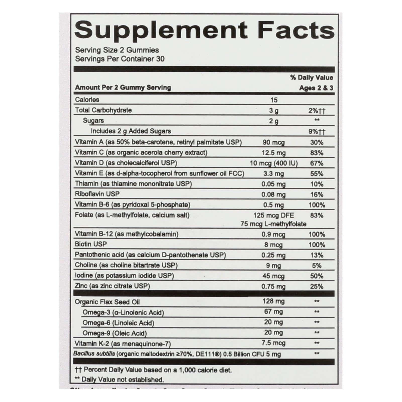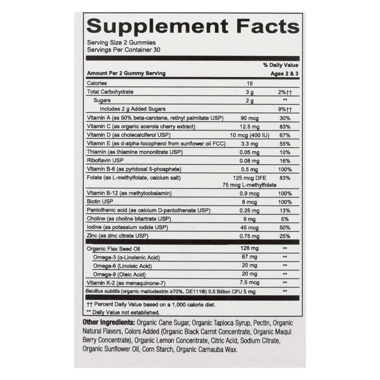 Dietary Supplement. USDA Organic. Certified Organic by QAI. Vegetarian. Multi and omega 3s fiber. Vitamin D3 for bones. Vitamin B12 for immunity. Vitamin A for eyehealth. We Want You to Know: that every nutrient that goes onto our gummies is carefully chosen based on extensive research. And just as much care goes into making them delicious. Vegetarian Superstar Ingredients: Vegetarian omega 3s; vitamin D as D3; vitamin B12 as methylcobalamin; folate as methylfolate; vitamin K as K2; Choline as vitacholine; zinc; beta carotene. 2 Delicious Flavors: cherr and mixed cherries. Free of: GMOs, felatin, soy, synthetic colors, artificial flavors and preservatives, yeast, wheat, milk, eggs, gluten, peanuts, tree nut allergens, fish, shellfish, and salicylates. Yay! Every batch 3rd party lab tested. Certified Vegetarian: American Vegetarian Association. www.SmartyPantsVitamins.com. Instagram. (at)SmartyPants. For Customer Support: 1-888-751-2291. Vitamin Angels proud supporter. 1 for 1 partner. Purity Award: Clean label project. This bottle is made from 80% post-consumer recycled material, and its label is printed on fiberstone tree-free/water-free paper made from stone. (These statements have not been evaluated by the Food and Drug Administration. This product is not intended to diagnose, treat, cure, or prevent any disease.) Manufactured in California from domestic and imported ingredients.