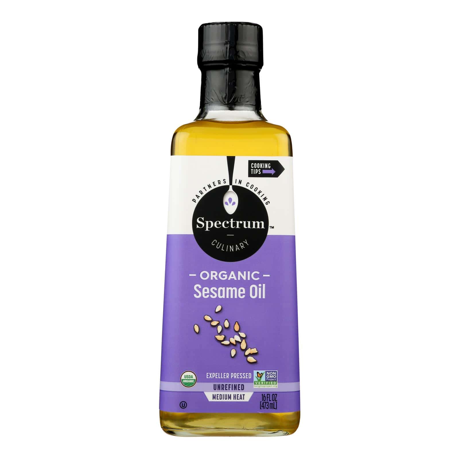 SPECTRUM NATURALS EXPELLER PRESSED SESAME OIL IS PERFECT FOR MEDIUM HEAT COOKING AS WELL AS SALAD DRESSING. THIS UNREFINED SESAME OIL HAS A RICH NUTTY FLAVOR THAT LENDS ITSELF TO SAUCES AND SALAD DRESSINGS, OR SAUTEING AT MEDIUM HEAT WHERE THE OIL’S FULL FLAVOR IS INTENDED AS AN INTEGRAL PART OF THE FINISHED DISH. A NON- HYDROGENATED FAT FOOD, OUR SESAME OIL IS CERTIFIED KOSHER AND NON-GMO. INCLUDES ONE 16 OZ. BOTTLE OF CHOLESTEROL AND TRANS-FAT FREE SPECTRUM NATURALS EXPELLER PRESSED SESAME OIL.