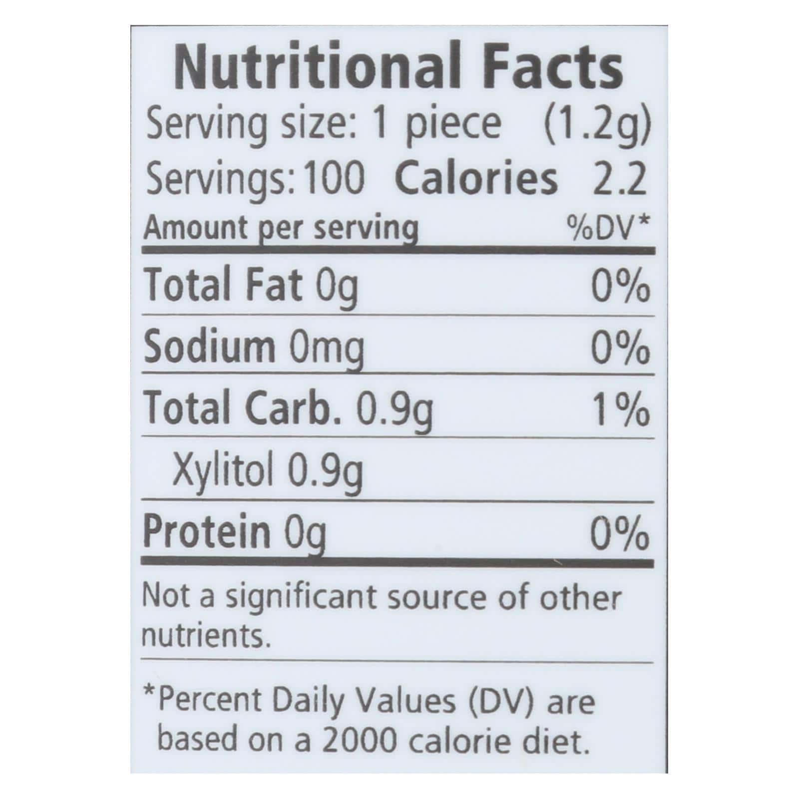 SPRY SUGARFREE CINNAMON CHEWING GUM IS MADE WITH XYLITOL, GUM BASE, NATURAL CINNAMON OIL, VEGETABLE GLYCERIN, GUM ARABIC, SUNFLOWER LECITHIN AND CARNAUBA WAX. EACH 100 COUNT BOX HAS 100 SERVINGS OF 1 PIECE EACH. EACH SERVING HAS 2.4 CALORIES. OUR CINNAMON CHEWING GUM IS VEGAN, NON-GMO AND GLUTEN-FREE.