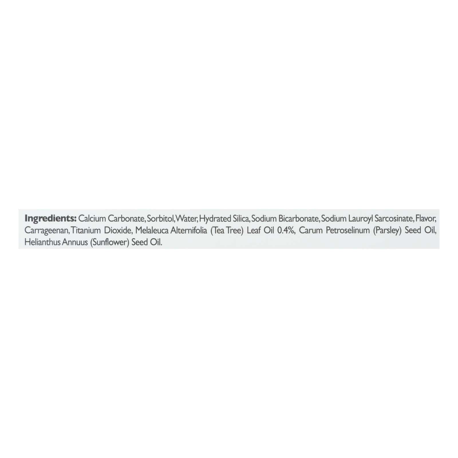 TEA TREE THERAPY TOOTHPASTE WITH BAKING SODA CONTAINS DUAL-CLEANING INGREDIENTS CALCIUM CARBONATE AND SODIUM BICARBONATE. IT ALSO CONTAINS NATURAL ANTISEPTIC TEA TREE OIL ALONG WITH PARSLEY SEED OIL, WHICH HELPS TO FRESHEN BREATH. EVERY 5 OZ. BOX OF OUR TEA TREE THERAPY TOOTHPASTE IS MADE IN THE U.S.A.