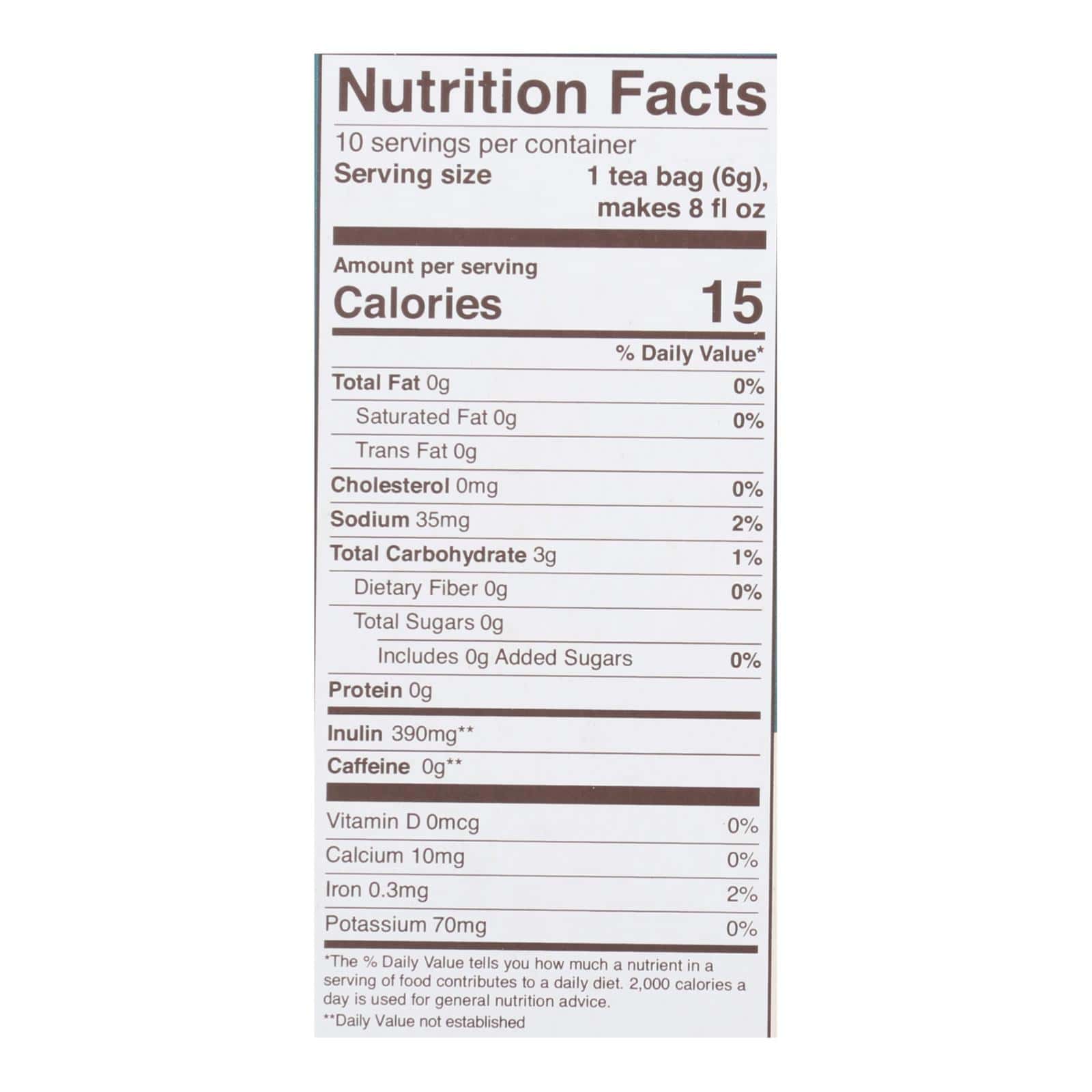 TEECCINO CHICORY DANDELION CARAMEL NUT HERBAL TEA IS CERTIFIED QAI ORGANIC AND CONTAINS 75% ORGANIC INGREDIENTS. IT IS ALSO KOSHER-PARVE AND CERTIFIED GLUTEN-FREE. TEECCINO CHICORY DANDELION CARAMEL NUT FEATURES CAROB, CHICORY, DANDELION ROOT, FIGS, ALMONDS AND NATURAL FLAVOR. EVERY 10-COUNT BOX CONTAINS NATURALLY CAFFEINE-FREE TEA. SEE NUTRITION FACTS PANEL FOR ALLERGENS.