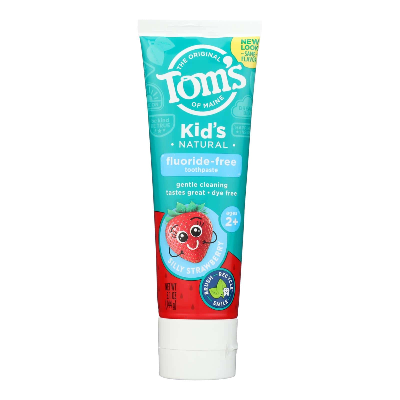 A gluten free product. Gentle cleaning tastes great dye free. Fluoride free. With real fruit juice! 20% more! vs. 4.2oz size. Since 1970. Silly Enough for Kids – Serious Enough for Parents! Not everyone wants fluoride in their children’s toothpaste. That’s why we offer a choice! Tom’s of Maine Fluoride-Free Children’s Toothpaste uses naturally sourced calcium and silica abrasives to gently clean teeth. Plus, it has a natural fruit flavor your kids will love to brush with again and again! What makes a product natural and good? At Tom’s, it includes how we make it: no animal testing; no artificial colors, flavors, fragrance, or preservatives; we share every ingredient, its purpose, and its source at www.tomsofmaine.com; sustainable practices are a priority in every aspect of our business; we strive to maximize recycled content and recyclability of our packaging; 5% (12 days) of employee time to volunteering. 10% of profits to human and environmental goodness. Learn more about our Stewardship Model and what we mean by natural at www.tomsofmaine.com. 1-800-For-Toms (1-800-367-8667). Certified B Corporation. BPA-free tube. Once empty, close cap and recycle with no.2 plastics.