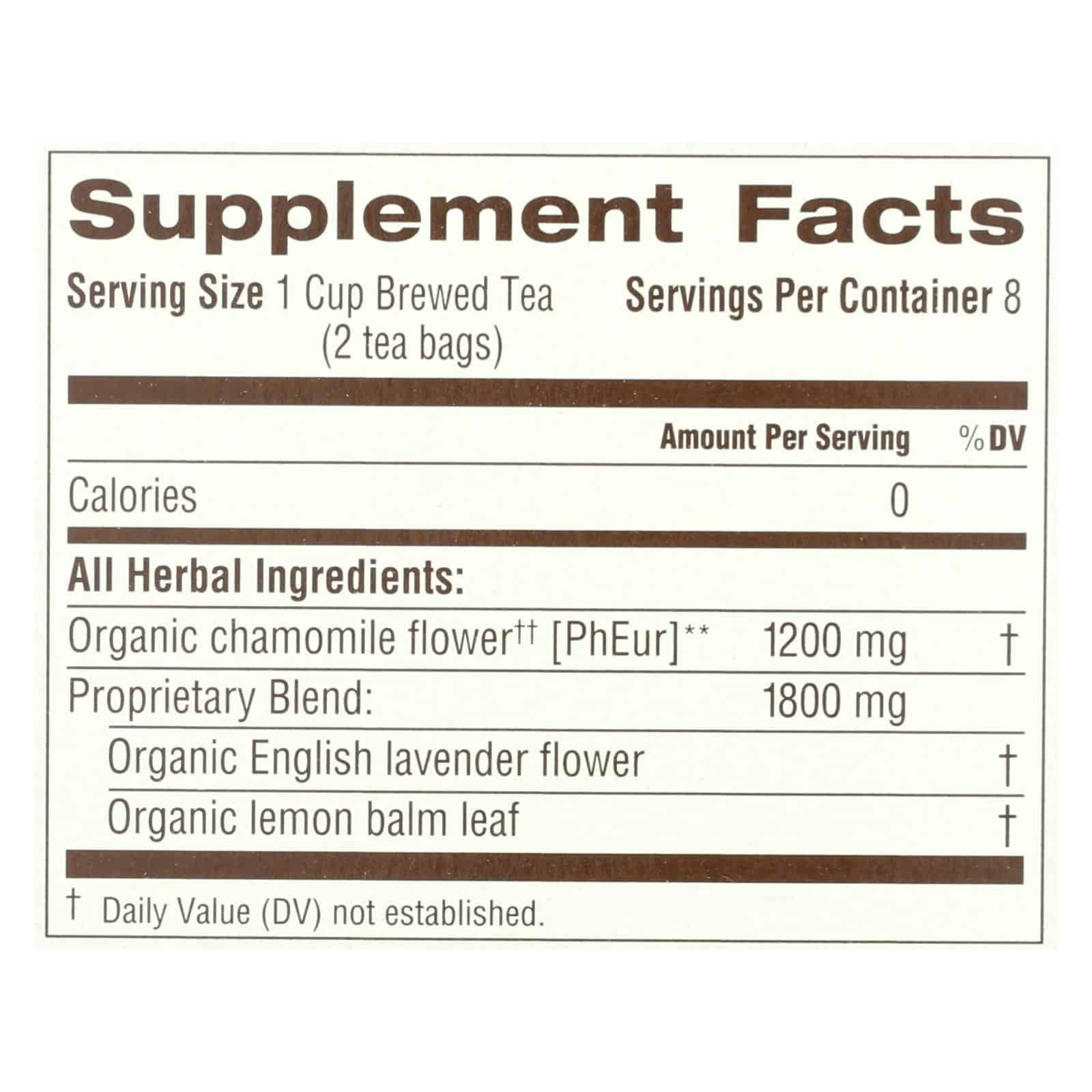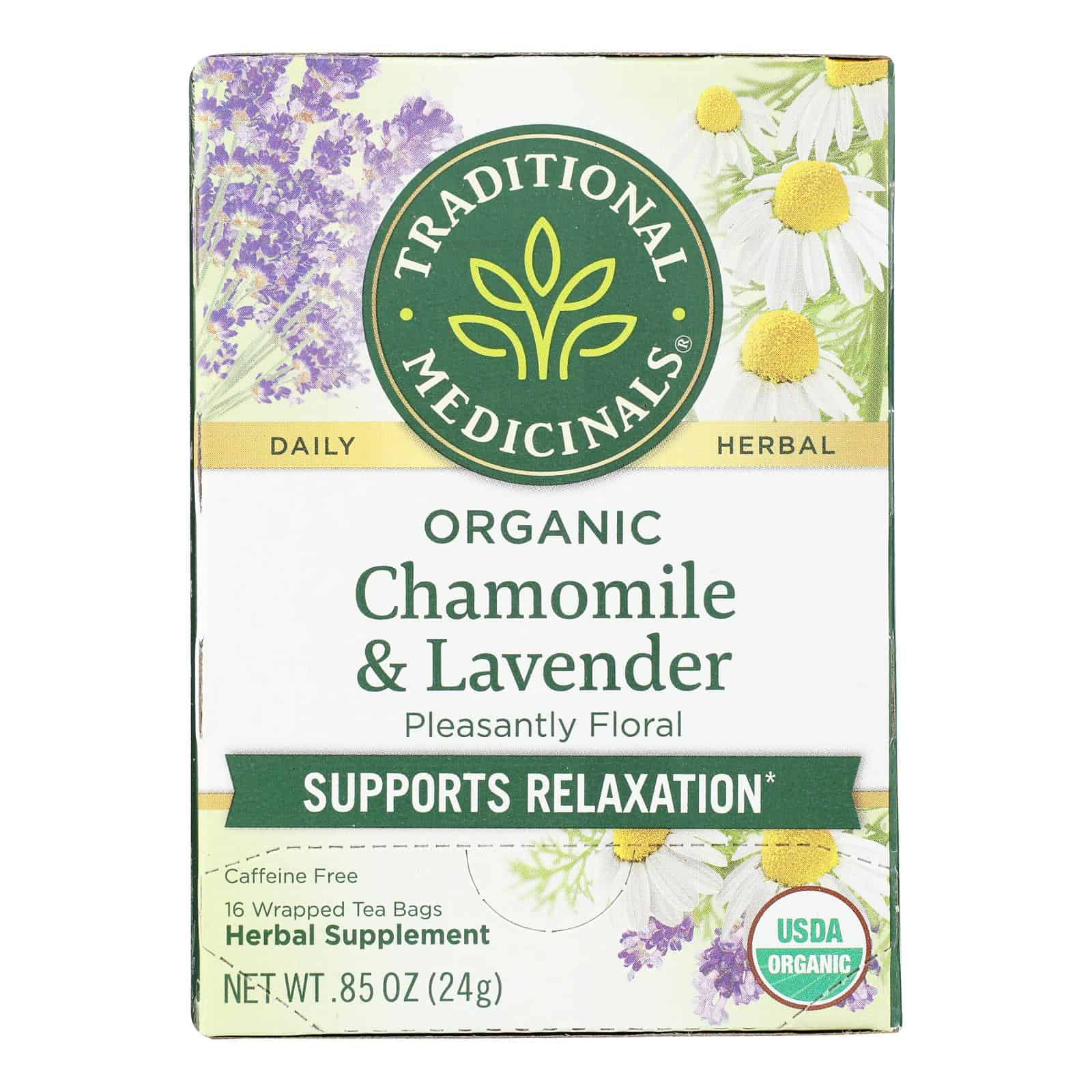 TRADITIONAL MEDICINALS’ CHAMOMILE WITH LAVENDER HERBAL TEA IS MADE WITH CERTIFIED USDA ORGANIC AND VERIFIED NON-GMO INGREDIENTS. EACH BOX CONTAINS 16 TEA BAGS OF OUR NATURALLY CAFFEINE FREE HERBAL TEA. CHAMOMILE FLOWER AND ENGLISH LAVENDER FLOWER COMBINE TO CALM AND RELAX THE NERVOUS AND DIGESTIVE SYSTEMS. SEE LABEL FOR WARNINGS AND RISKS.