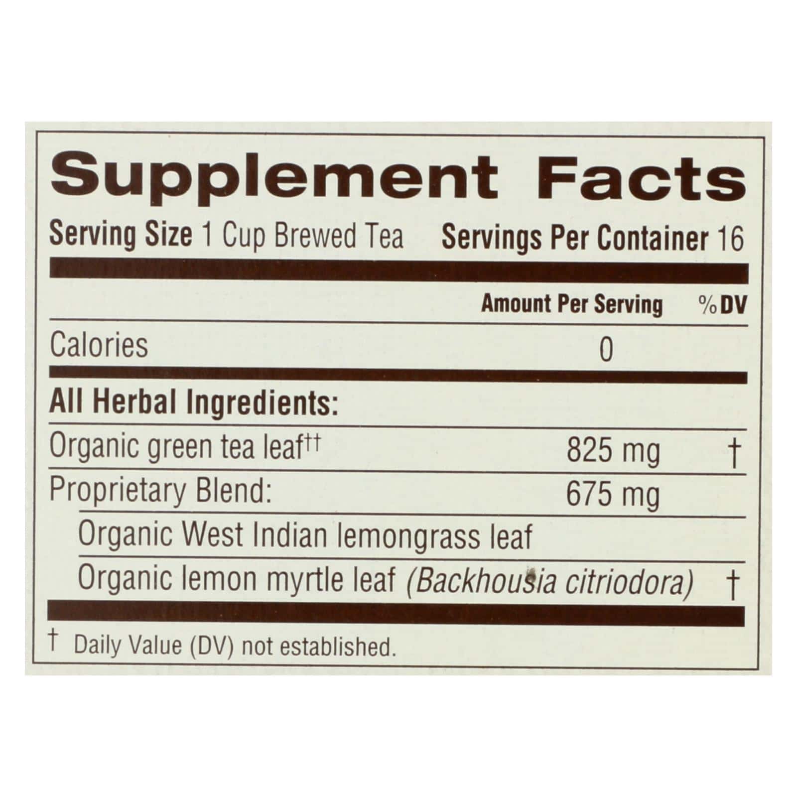 TRADITIONAL MEDICINALS’ GREEN TEA LEMONGRASS BAGGED TEA IS MADE WITH CERTIFIED USDA ORGANIC AND VERIFIED NON-GMO INGREDIENTS. EACH BOX CONTAINS 16 NATURALLY CAFFEINATED TEA BAGS. WE ADDED ORGANIC LEMONGRASS LEAF TO COMPLEMENT THE REFRESHING, STIMULATING NATURE OF GREEN TEA. SEE LABEL FOR WARNINGS AND RISKS.