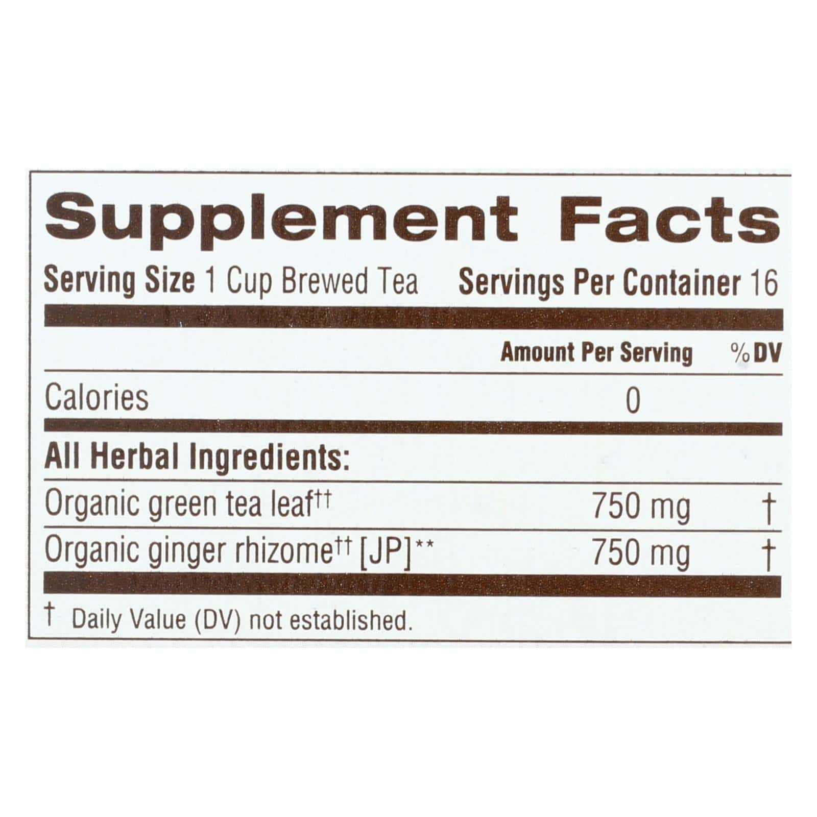 TRADITIONAL MEDICINALS’ GREEN TEA GINGER BAGGED TEA IS MADE WITH CERTIFIED USDA ORGANIC, FAIRTRADE CERTIFIED AND VERIFIED NON-GMO INGREDIENTS. EACH BOX CONTAINS 16 NATURALLY CAFFEINATED TEA BAGS. INGREDIENTS LIKE GINGER AND GREEN TEA LEAVES PROMOTE HEALTHY DIGESTION. SEE LABEL FOR WARNINGS AND RISKS.