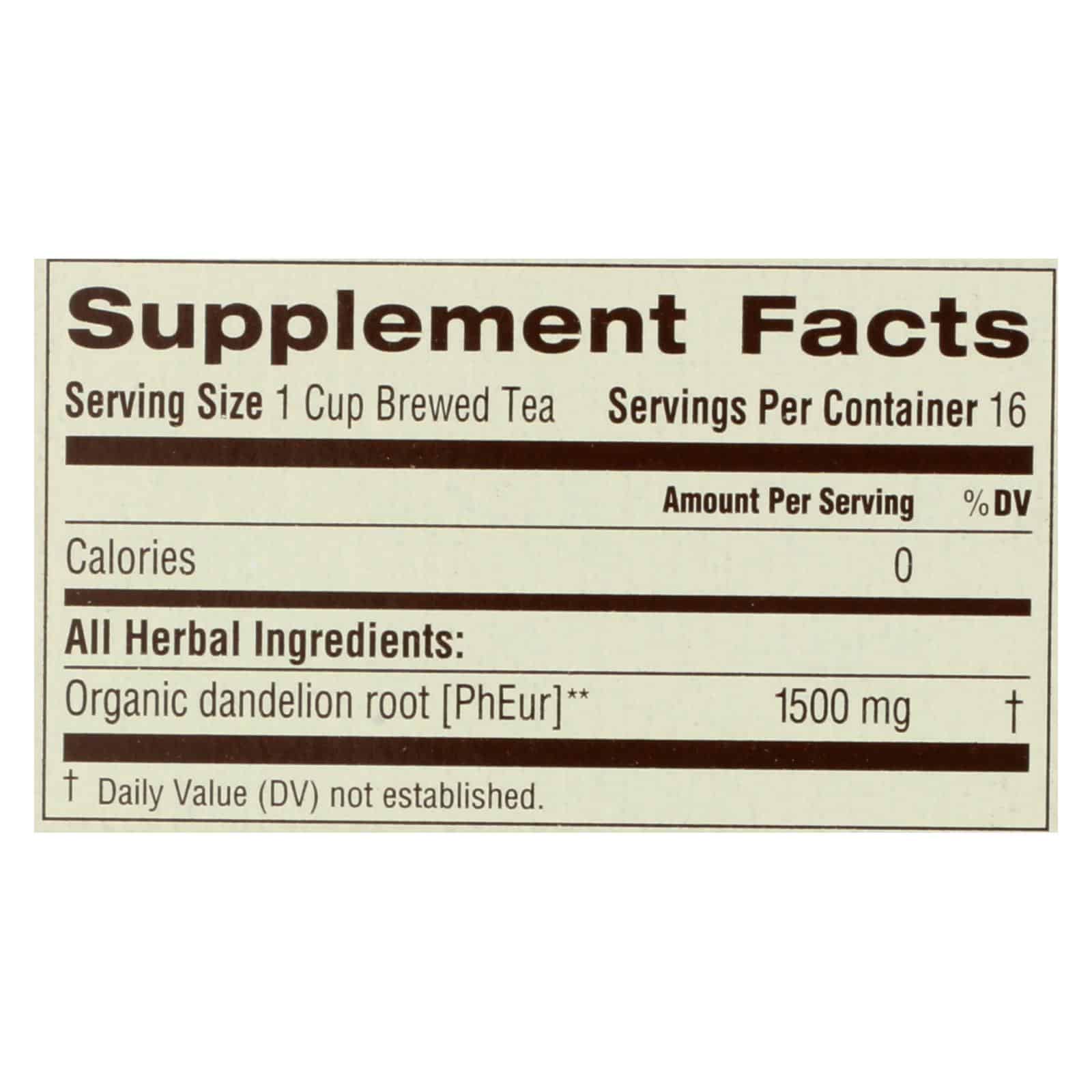TRADITIONAL MEDICINALS’ ROASTED DANDELION ROOT BAGGED TEA IS MADE WITH CERTIFIED USDA ORGANIC AND VERIFIED NON-GMO INGREDIENTS. EACH BOX CONTAINS 16 TEA BAGS OF OUR NATURALLY CAFFEINE FREE HERBAL TEA. THE PRIMARY INGREDIENT, ORGANIC DANDELION ROOT, GIVES OUR TEA IT’S ABILITY TO SUPPORT NATURAL DETOXIFICATION AND HEALTHY DIGESTION. SEE LABEL FOR WARNINGS AND RISKS.