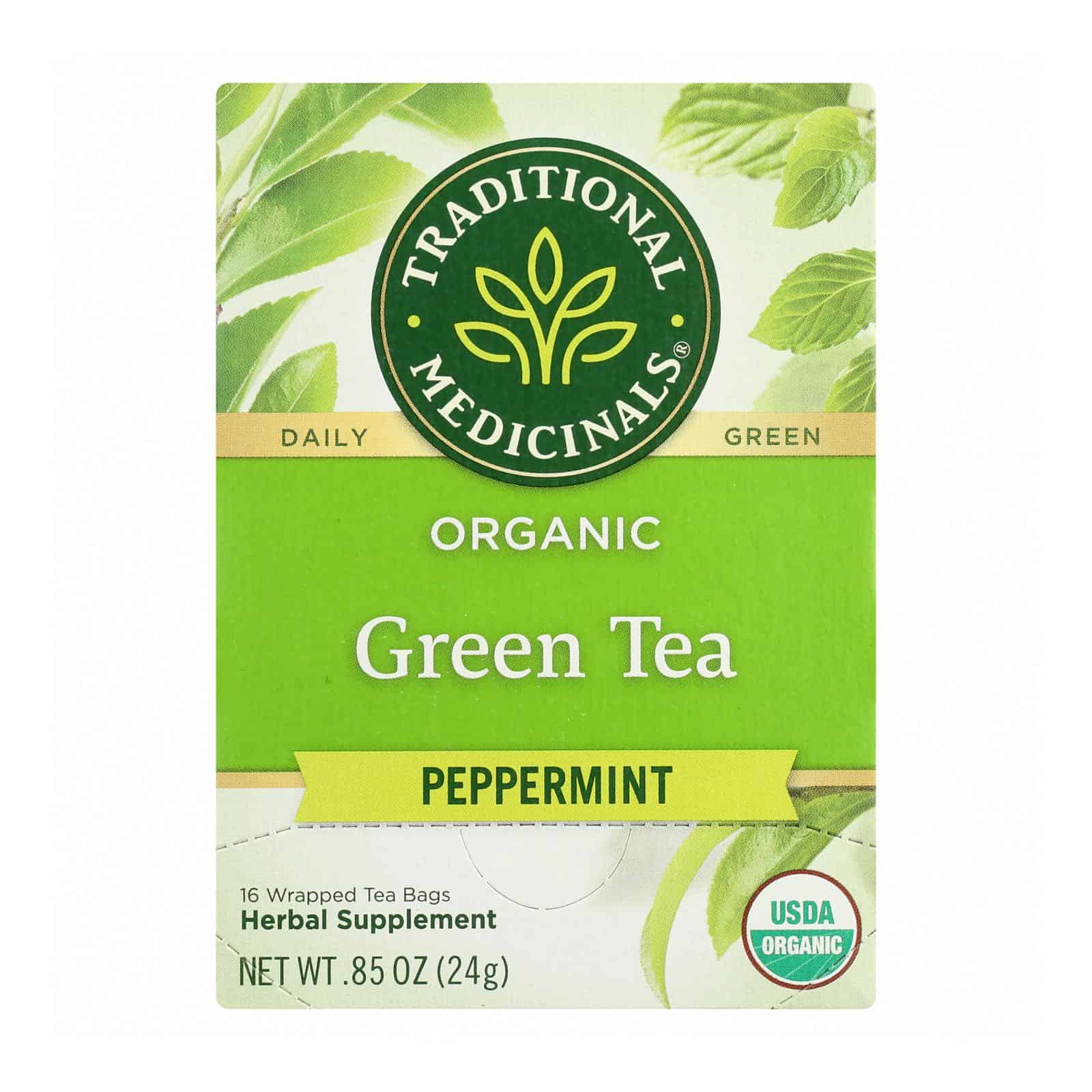 TRADITIONAL MEDICINALS’ GREEN TEA PEPPERMINT BAGGED TEA IS MADE WITH CERTIFIED USDA ORGANIC AND VERIFIED NON-GMO INGREDIENTS. EACH BOX CONTAINS 16 NATURALLY CAFFEINATED TEA BAGS. INGREDIENTS LIKE PEPPERMINT LEAF AND GREEN TEA LEAVES PROMOTE THE BODY’S NATURAL DETOXIFICATION AND DIGESTION PROCESSES. SEE LABEL FOR WARNINGS AND RISKS.