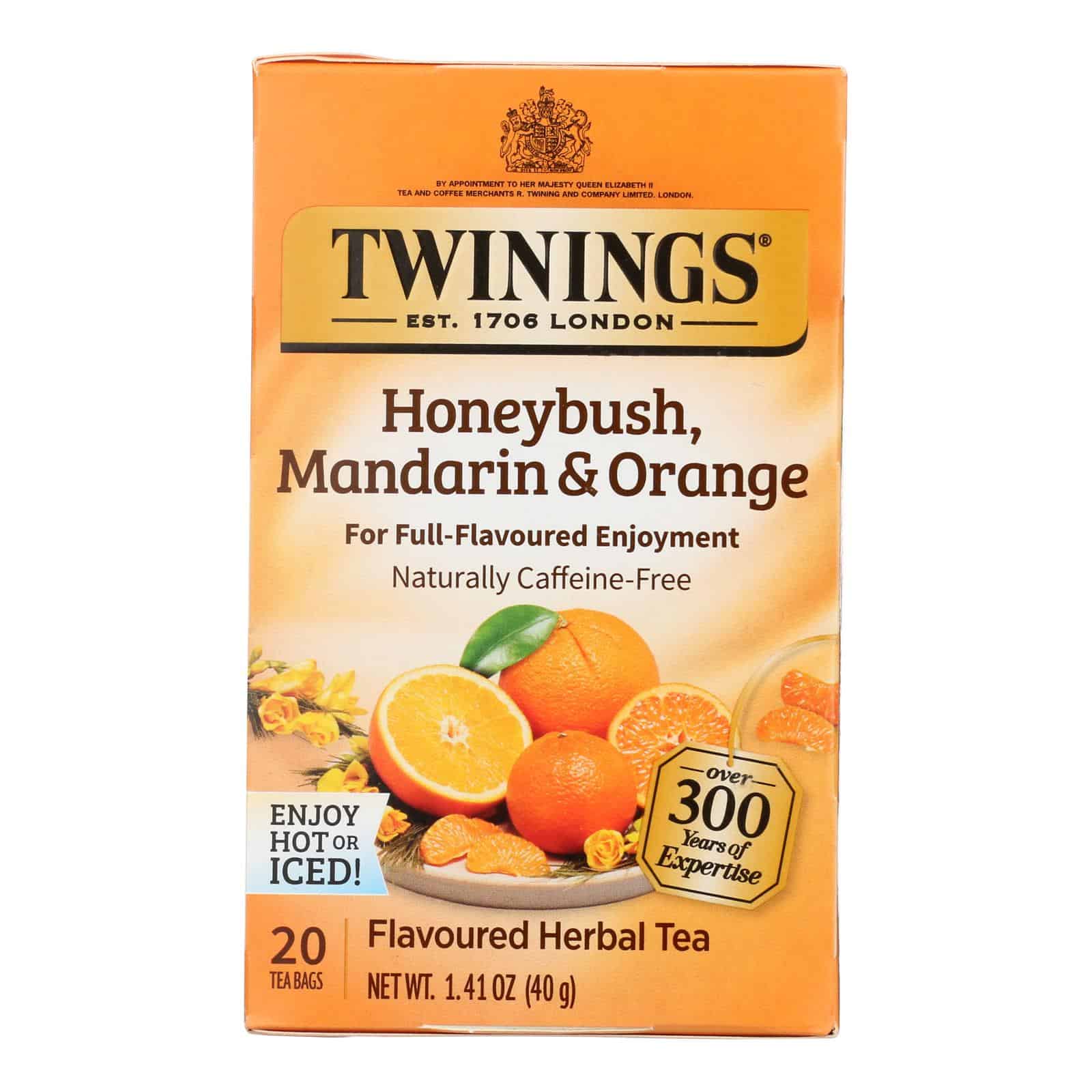 TWININGS OF LONDON HONEYBUSH, MANDARIN & ORANGE HERBAL TEA OFFERS A REFRESHING CITRUS EXPERIENCE WITH NATURAL SWEETNESS. SEALED INDIVIDUAL TEA BAGS STAY FRESH AND MAKE IT EASY TO BREW YOUR CUP OF TEA, AND THIS TEA IS NATURALLY FREE OF CAFFEINE, SO YOU CAN SIP IT DAY OR NIGHT. IT WORKS WELL HOT OR COLD, MAKING IT A VERSATILE DRINK OPTION. HAVE THIS 20 COUNT BOX ON HAND WHEN YOU WANT A FRESH, LIGHT BEVERAGE.