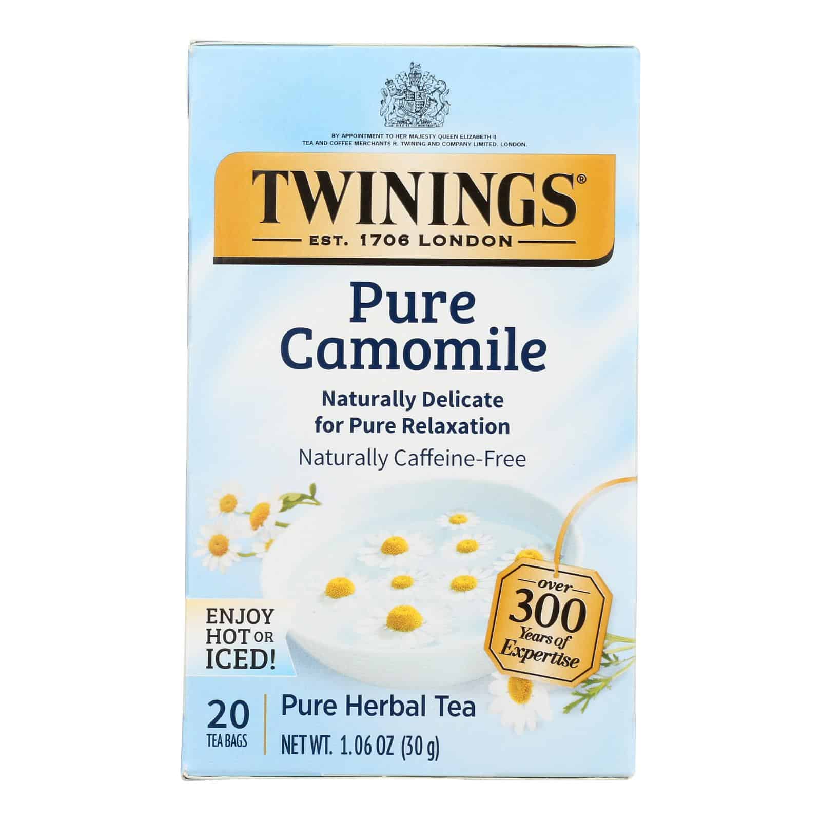 TWININGS OF LONDON PURE CAMOMILE HERBAL TEA CONTAINS ONLY CAMOMILE BLOSSOMS FOR A PURE BEVERAGE. DESIGNED TO PROMOTE RELAXATION, THIS HERBAL TEA OFFERS A SMOOTH FLAVOR ACCENTED BY A SOFT FLORAL AROMA TO SOOTHE YOUR MIND AND BODY. PACKED IN TEA BAGS, THIS HERBAL BREW IS READY FOR STEEPING, AND THE BAGS COME INDIVIDUALLY SEALED TO PRESERVE FRESHNESS AND QUALITY. BREW A CUP FROM THIS 20 COUNT PACKAGE OF HERBAL TEA TO WIND DOWN AT THE END OF THE DAY.