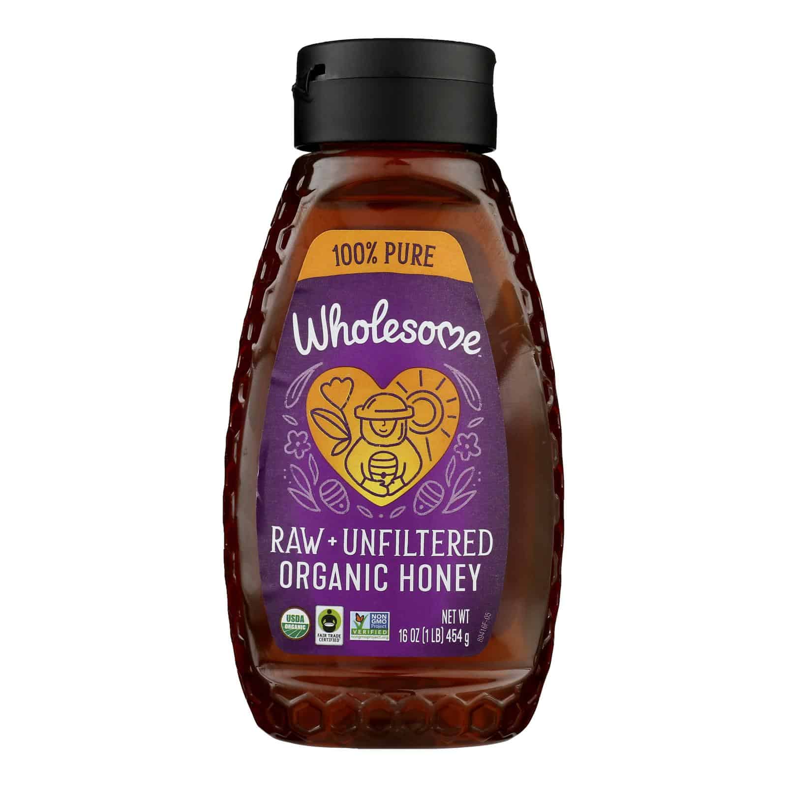 WHOLESOME! ORGANIC RAW AND UNFILTERED HONEY IS CERTIFIED NON-GMO AND FAIR TRADE. OUR HONEY IS NATURALLY GLUTEN-FREE, FREE FROM PESTICIDES AND ANTIBIOTICS AND APPROVED FOR KOSHER DIETS. THIS HONEY COMES FROM BEES THAT FORAGE ON ORGANIC WILDFLOWERS IN PROTECTED FORESTS, ENSURING YOU HAVE A PURE, NATURAL SWEETENER. THIS INVERTED SQUEEZE BOTTLE HOLDS 16 OZ. OF RAW, ORGANIC AND UNFILTERED HONEY.