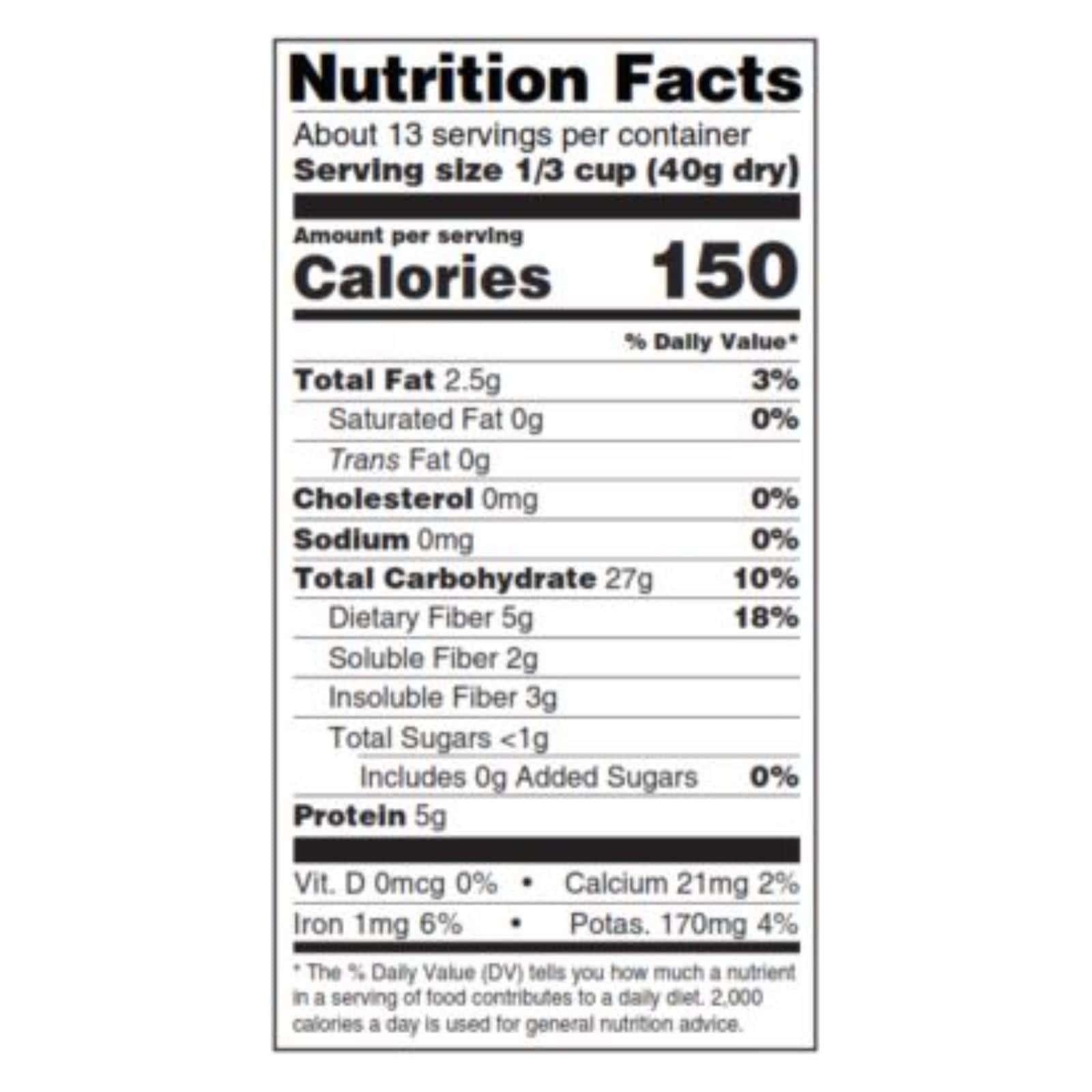 100% Whole Grain: 48 g or more per serving. Eat 48 g or more of whole grains daily. WholeGrainsCouncil.org. Heart Healthy: Reduces the risk of heart disease. Diets low in saturate fat and cholesterol and rich in fruits, vegetables, and grain products that contain some types of dietary fiber, particularly soluble fiber, may reduce the risk of heart disease, a disease associated with many factors. No sugar added (not a low calorie food). See nutrition information for sugar and calorie content. Non-GMO. Non GMO Project verified nongmoproject.org. Cooks in 6 minutes or less. Eat because it’s good! Here at Woodstock we celebrate foods that make you feel great about what you buy, eat, and serve your family. Our ingredients are simple, satisfying, and farmed from sources you can trust. Our team has been at it for over 30 years bringing passion for organic, non-GMO, and totally delicious food to the table. Woodstock-foods.com. Woodstock. Eat because it’s good. Cereal is filled by weight, settling may occur. Let’s get social! Instagram. Facebook. Twitter. Find us (at)woodstockfoods. No farmers. No food. American Farmland Trust. www.farmland.org. Proud Supporter of American Farmland Trust. Produced in the USA with domestic and imported ingredients.