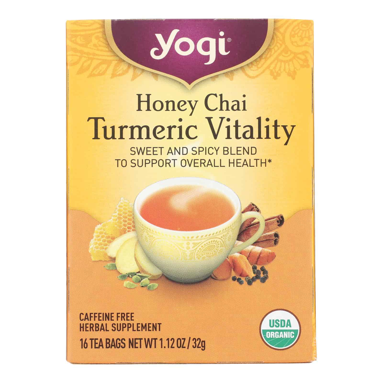 Herbal Supplement. USDA Organic. Certified Organic by QAI, Inc. Vegan. Caffeine free. Non GMO Project verified. nongmoproject.org. Sweet and spicy blend to support overall health. Our story began: In 1969 when Yogi Bhajan, an inspirational teacher of holistic living, started teaching yoga in the West. While sharing his wisdom and knowledge of herbs and healthy living, he would serve his students an aromatic spiced tea they affectionately named Yogi Tea. Support overall health with honey chai turmeric vitality: This intriguing chai blend begins with Turmeric, traditionally used in Ayurveda for its abundant health promoting qualities. To this we add sweet Honey flavor, and warming spices Cinnamon, Cardamom, Ginger and Clove, to deliver a rich sweet and spicy chai flavor. Enjoy Honey Chai Turmeric Vitality throughout the day to support your overall health and well-being. Non-irradiated ingredients. Oxygen-bleached tea bags. yogiproducts.com. At Yogi, it’s about more than creating deliciously purposeful teas. Learn about our efforts to do good at home and around the world at yogiproducts.com/doing-good. Learn more about our teas at yogiproducts.com. Certified B Corporation. Compostable tea bags. Recyclable packaging. (These statements have not been evaluated by the FDA. This product is not intended to diagnose, treat, cure, or prevent any disease.)