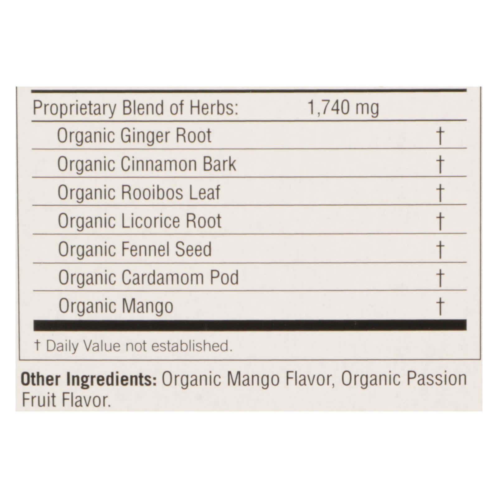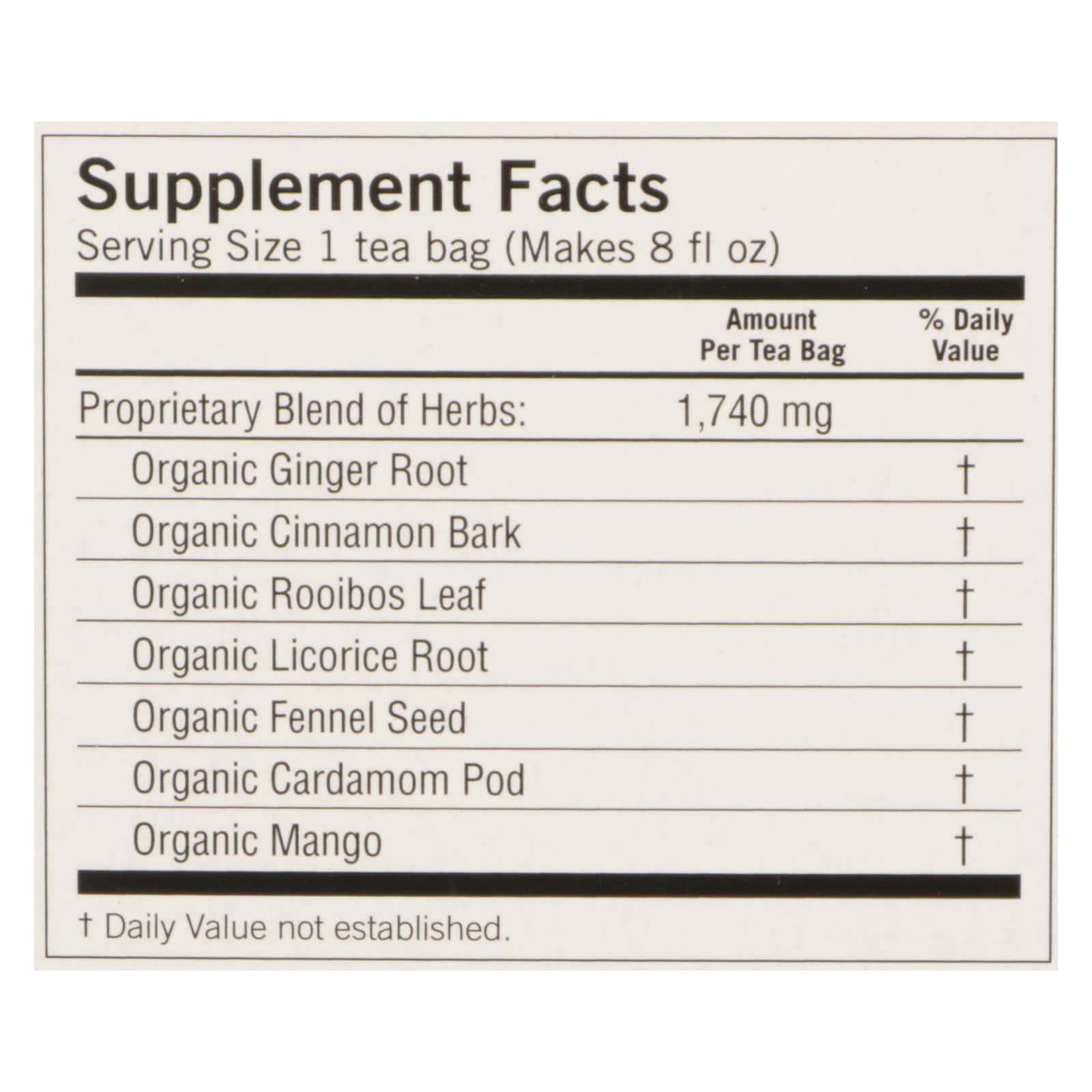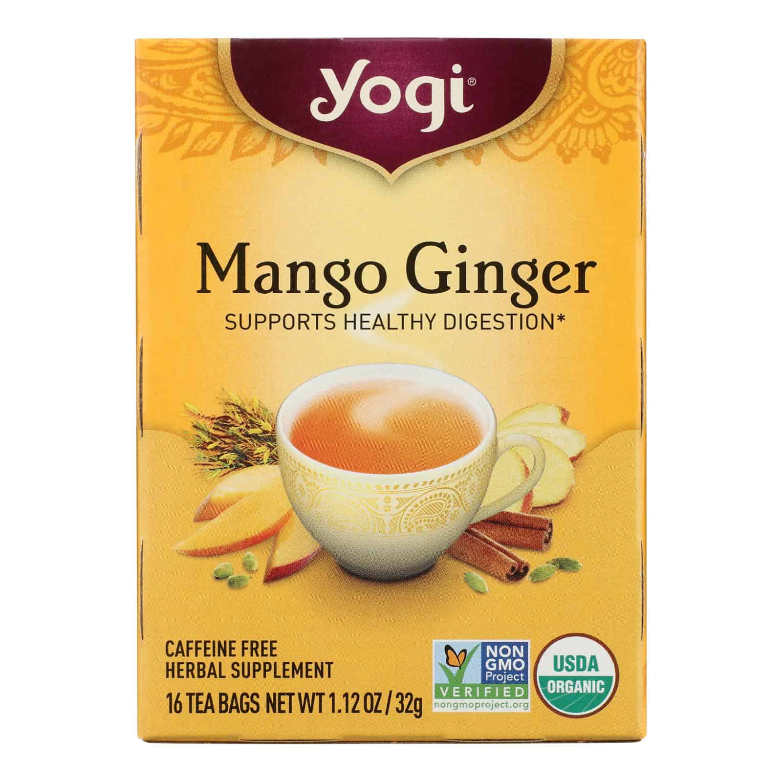 YOGI TEA MANGO GINGER IS A ZESTY BLEND FORMULATED WITH GINGER, TRADITIONALLY USED IN AYURVEDA FOR ITS’ WARMING PROPERTIES AND TO SUPPORT DIGESTION. YOGI TEA COMBINES MANGO AND ROOIBOS TO CREATE A DELECTABLE AND ANTIOXIDANT RICH TREAT TO DRINK ANYTIME, OR IF YOU HAVE AN UPSET STOMACH. FOR BEST RESULTS, BRING WATER TO A BOIL AND STEEP YOGI TEA MANGO GINGER FOR SEVEN MINUTES. CREATED BY YOGI BHAJAN IN 1969 TO SERVE TO HIS STUDENTS, YOGI TEA INSPIRES TO SHARE YOGI BHAJAN’S WISDOM OF HEALTHY LIVING BY CREATING DELICIOUSLY PURPOSEFUL TEAS. CONSULT LABEL FOR MEDICAL WARNINGS INFORMATION.